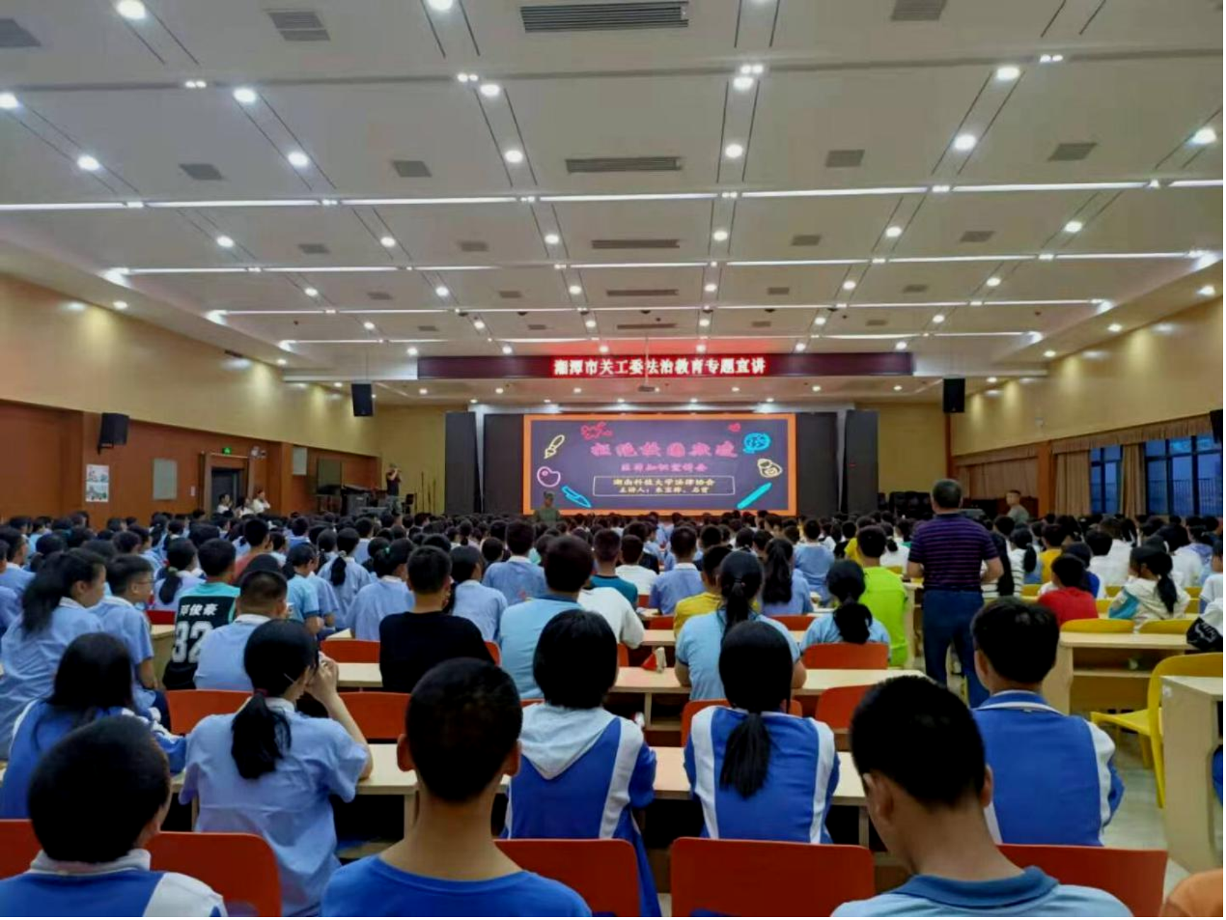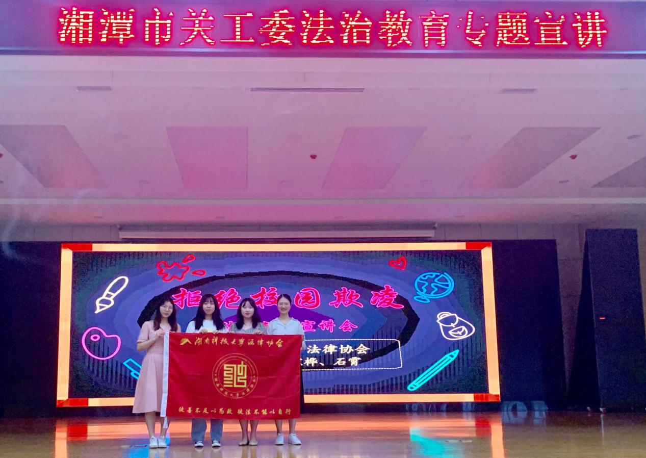 和法律服务中心联合打造的法律协会法治宣讲团应湘潭市关工委邀请来到湘潭市示范性综合实践基地进行了主题为“拒绝校园欺凌”的普法宣讲活动,来自湘潭市湘纺中学、易家湾镇中学、荷塘中学的500多名学生参加了活动。