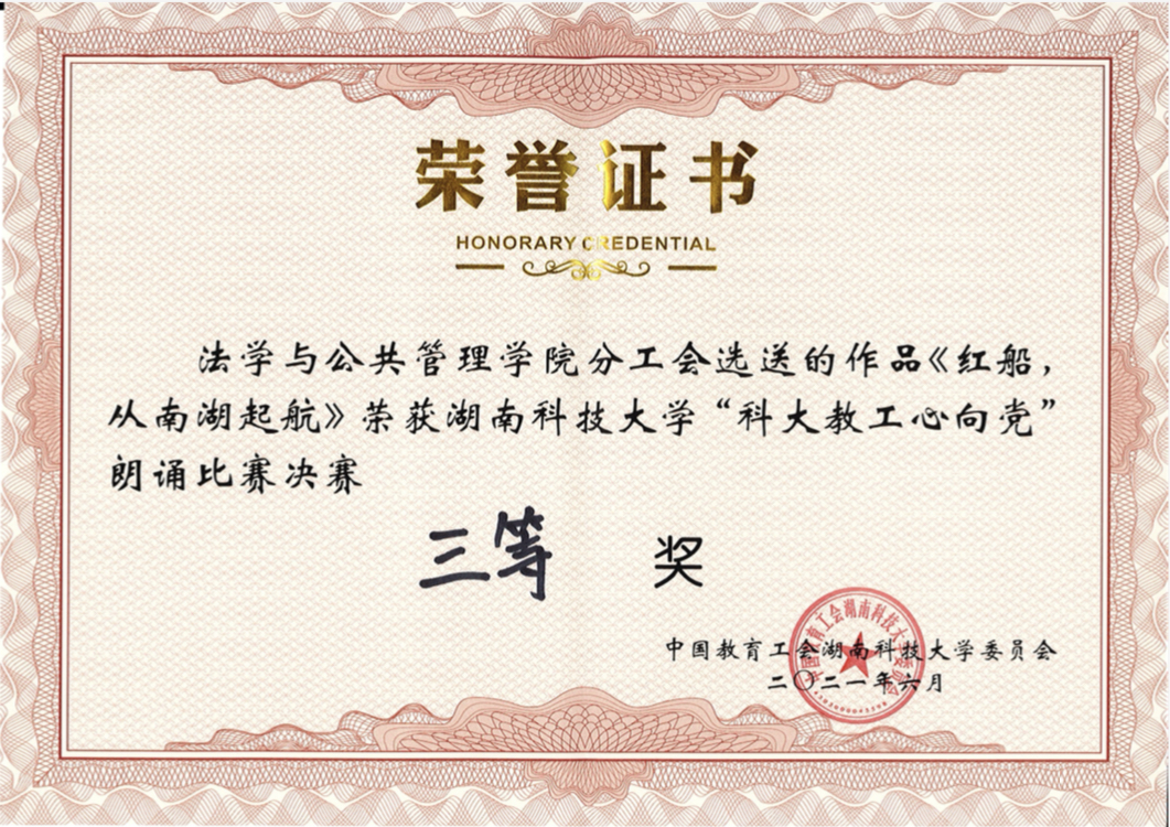 金牌影院徐德刚教授、喻军教授、洪婕老师、马欢老师以及教工子弟彭琴、王九晔组成的代表队朗诵《红船,从南湖起航》,在柔美的背景音乐中,他们满怀深情、激扬澎湃,重温中国革命航船扬帆起航的历程,赞扬红船精神,获得全场观众的热烈掌声。经过激烈角逐,金牌影院作品在12个比赛节目中脱颖而出,荣获三等奖。