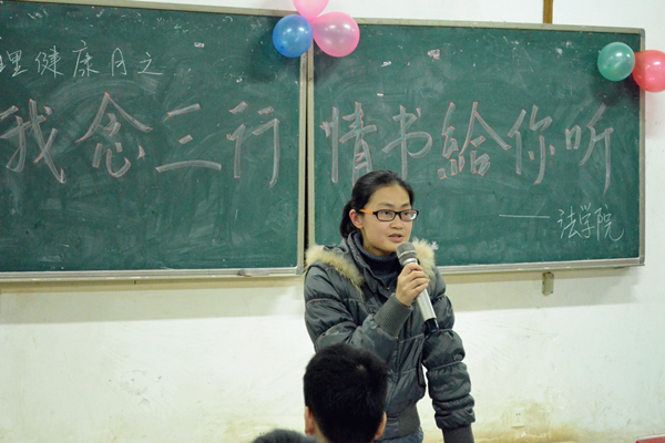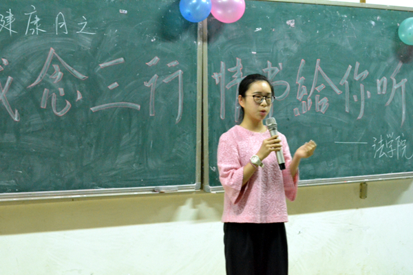 ——记金牌影院心理健康月之“我念三行情书给你听” 爱你,只用三行字来表达。情书三行,为爱发声。4月23日晚7时,金牌影院心理健康月之“我念三行情书给你听”初赛于八教1-3教室举行。莅临此次活动的嘉宾有辅导员赵晗冰老师、团委第二副书记段欣、学生会副主席姚逸飞以及各部部长。2015级全体学生到场观看。 莎士比亚曾经写过“十四行情诗”仍觉意犹未尽,如今8位选手将“情”话浓缩成唯美的文字,只三行,便跃然纸上。法学三班李文俊同学以一首藏头诗大胆说出自己“既直且忠”的爱情,同时将《诗经》的古朴典雅与《离骚》的含蓄优美巧妙融合,赢得掌声阵阵。将严峻冷酷的法律写进深情温柔的诗句又是怎样一番滋味呢?法学二班文章华愿成为一部民诉,陪伴守护她一生。正如那句,陪伴是最长情的告白。 在这个世界上,最爱我们的,莫过于父母。“你藏死鬓角的白发/我假装看不见你眼角的皱纹/都只是不想承认时间逝去了你的年华”岁月不经意间从身边划过,我们的青葱岁月伴随着他们的老去。法学二班杜芳芳为亲情发声,触动了多少人的内心。“平淡如烟的人生有两个小幸运点缀足矣/一是遇见你/一是走到底”,法学二班王卓时向大家讲述了她与“亲”妹妹的故事:虽无血缘关系,却拥有至亲至爱的美好回忆。 经过激烈的角逐,李文俊、王卓时获得一等奖;张琴、杜芳芳、罗翎雪获得二等奖;文章华、卜芝月、陈泓廷获得三等奖。 大赛最后,赵晗冰老师也分享了自己的作品:“你站在那里/世界就是一首情诗/我愿用莎士比亚的方式爱你”,并总结道“通过比赛,我看到了同学们内心的丰盈与澎湃,这才是青春的感觉。最真挚的情感,原本就不需要过多的语言来描述。爱你,三行足矣”。 (责任编辑:admin) |