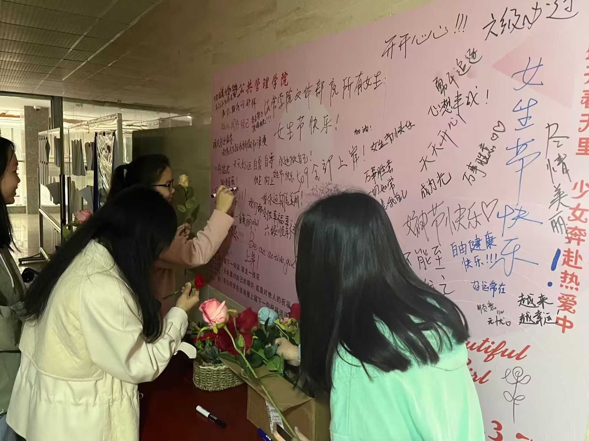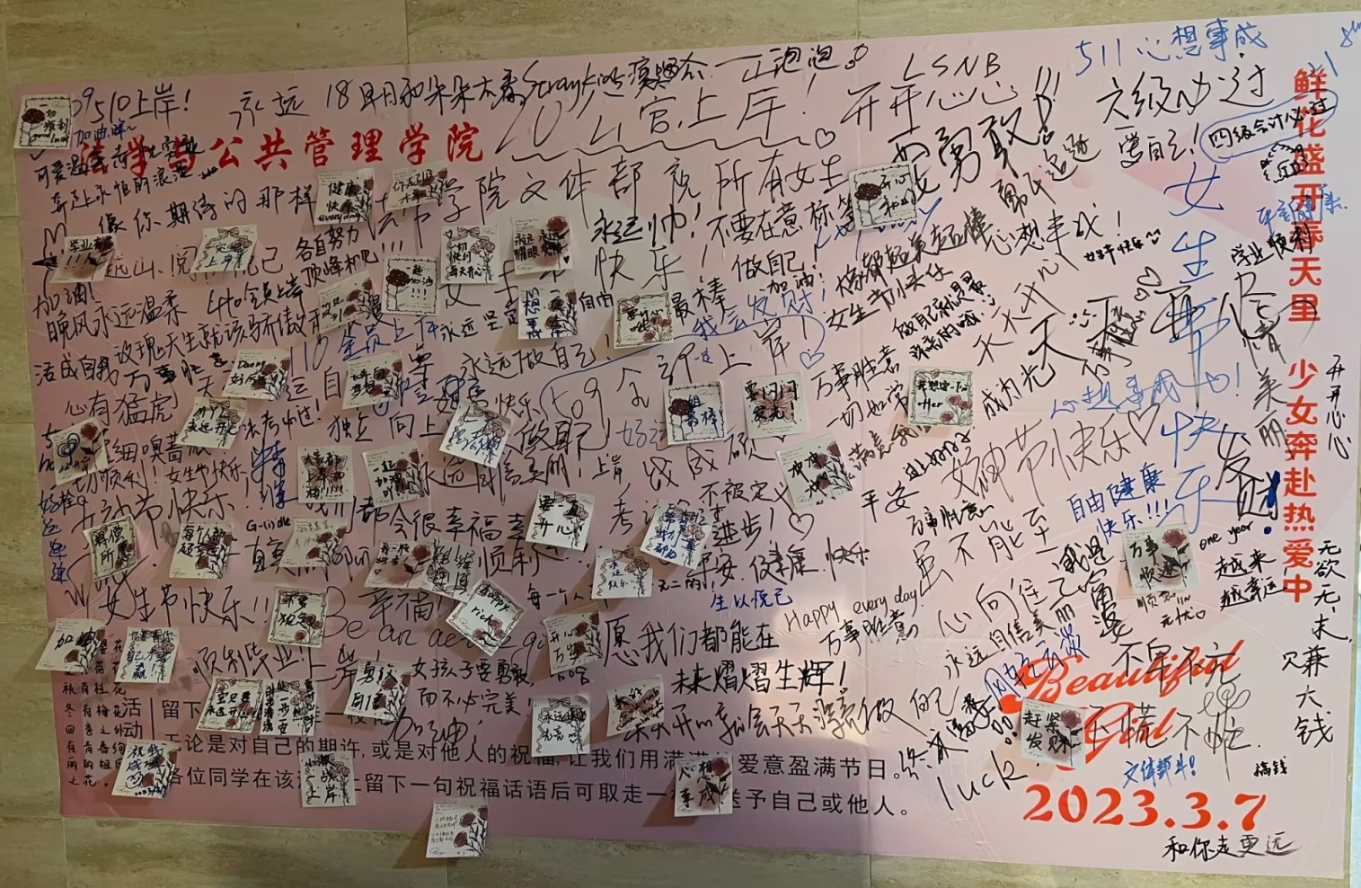 3月7日,文体部成员于立言楼二楼设置“春日鲜花礼”祝福墙,吸引众多同学前来参加活动,大家在留言板写下对自己的期许以及对各位女生真诚的祝福。留言板中“上岸”、“做自己”、“不被定义”的字样彰显着女孩子们积极向上的朝气与力量。此活动向大家传递春日温暖,也充分体现了金牌影院对女性的尊重与爱护。