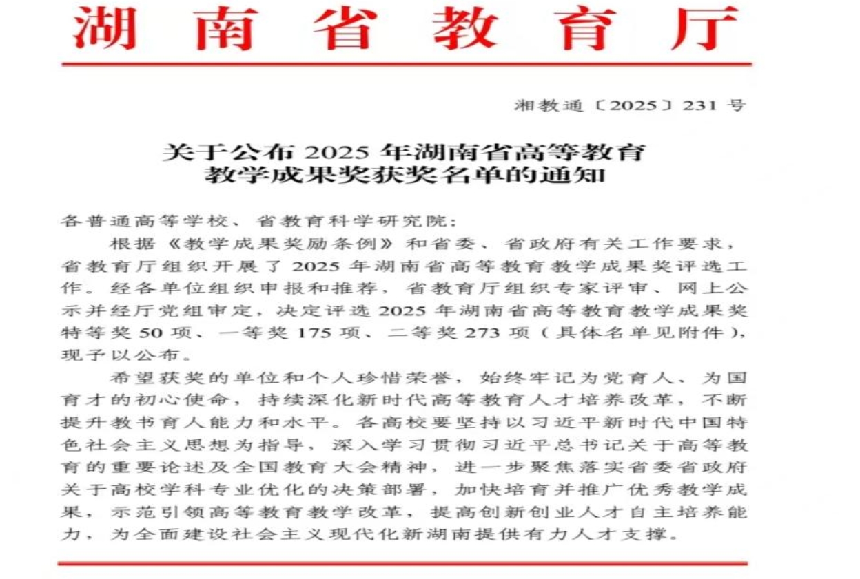 近日,湖南省教育厅正式公布2025年全省高等教育教学成果奖获奖名单,金牌影院