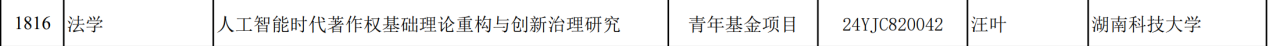 教师汪叶博士申报的《人工智能时代著作权基础理论重构与创新治理研究》获批青年基金项目。