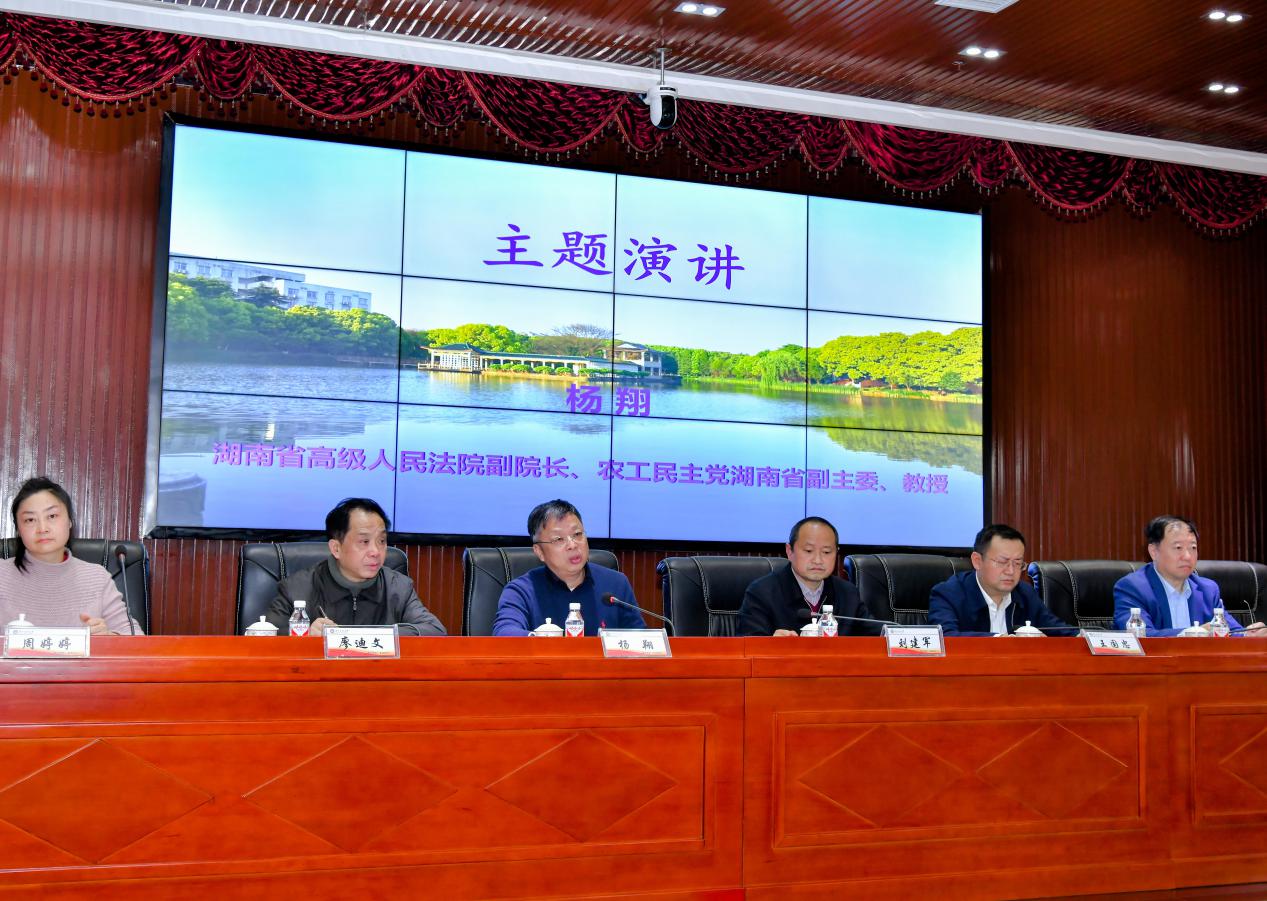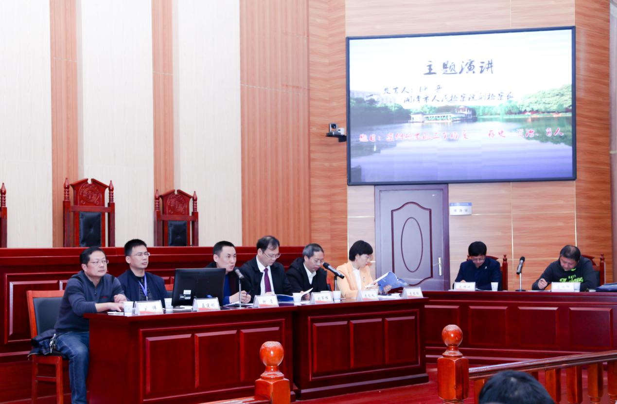 校长朱川曲,湖南省高级人民法院副院长杨翔,湘潭市中级人民法院院长廖迪文,湘潭市人民检察院检察长刘建军、湖南省人大常委会备案审查处处长常文平、湖南省人民检察院法律政策研究室主任王国忠、湖南省法学会副秘书长罗良方、湖南省高级人民法院行政审判庭副庭长周婷婷等来自省人大、省高院、省检察院、省法学会等部门的领导出席活动并讲话,金牌影院党委书记黄伟担任主持人。