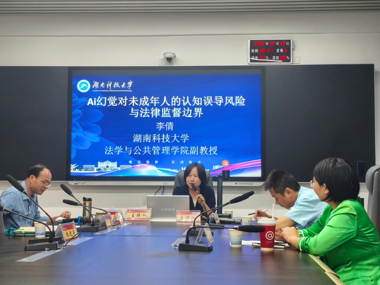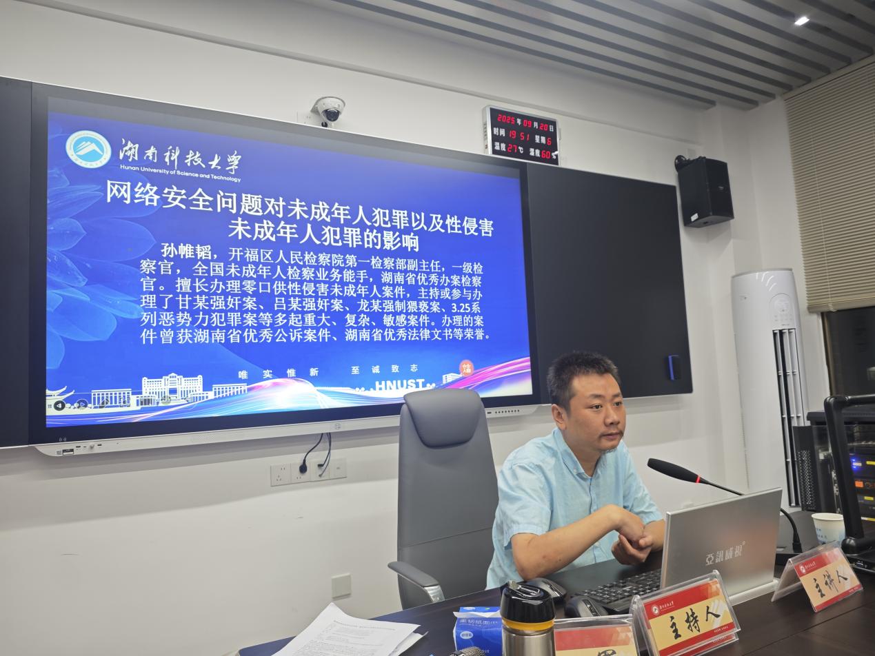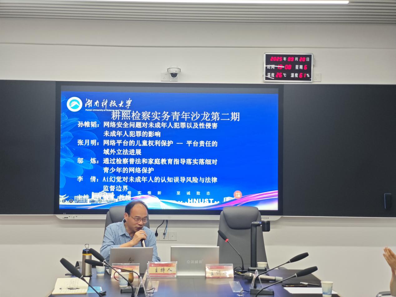 2025年9月20日晚,以“未成年人网络信息安全的法律监督”为主题的第2期耕熙检察实务青年沙龙在我校立言楼A303教室成功举办。本次沙龙由金牌影院喻军教授主持,就职于国内互联网公司的数据研究员张月明博士、长沙市开福区人民检察院普通犯罪检察部副主任孙帷韬、长沙市岳麓区人民检察院普通犯罪检察部副主任邬炼以及金牌影院副教授李倩共同开讲。金牌影院省哲学社会科学重点研究基地主任胡之芳、基地副主任雷莲莉、谢潇、陈小杉等多位基地骨干教师及24级、25级法律硕士共同参与了本次活动。
