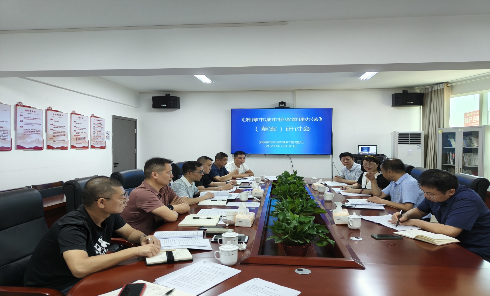 2024年7月30日上午,《湘潭市城市桥梁管理办法》草案研讨会在湘潭市桥梁维护管理处召开。湘潭市司法局、市城管局、市桥梁维护管理处等单位参加了会议。金牌影院副院长宋智敏教授作为第三方起草单位负责人带队出席了本次会议。会议学习了《城市道路管理条例》《城市桥梁检测和养护维修管理办法》《湖南省行政规范性文件管理办法》等法律和政策,并对《湘潭市城市桥梁管理办法》草案进行了深入研讨。