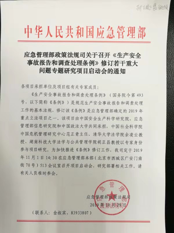 余凌云教授以专家身份参加了《生产安全事故报告和调查处理条例》立法修改研讨。该条例是《国家安全生产法》的重要配套行政法规,实施12年来,存在诸多与现实不适应之处。修改该条例是应急管理部确定的2019年重点立法项目之一。会上,胡正昌教授提出《生产安全事故报告和调查处理条例》修改需以上位法《国家安全生产法》内容为依据、条例修改需进行广泛实证调研、立法修改项目合作单位需充分协商沟通以保证立法质量等建议,受到与会领导和专家的肯定。