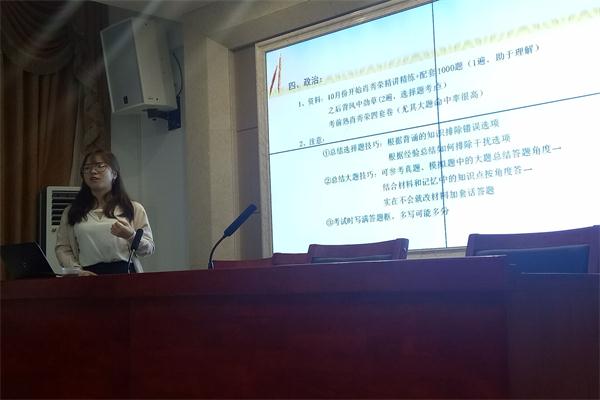 刘静学姐第一个分享了她的考研经验。首先是英语,单词要认真备考,专注于一本单词书,不熟悉的单词单独记在本子上,一定要注意的是要有技巧的重复,联系记忆;对于长难句的记忆要在网上观看视频;英语阅读方面要争取一篇阅读,因为分值很重;作文方面,自己总结万能模板。政治上,十月份开始做题,之后背风中劲草,考前熟练四套卷,要注意总结每道题的技巧,考试时尽量写满答题框,可能会多给分。刘静学姐通过他的努力成功考入许多人梦寐以求的西南政法大学研究生。