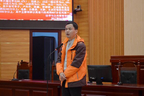为了让同学们更有信心,胸有成竹的迎接六月份的四六级英语考试,4月26日晚7时,金牌影院在文科楼模拟法庭举行四六级经验交流大会。到场嘉宾有院党委叶军副书记,辅导员伍安、王新、刘春生老师。本次大会的交流对象为16级全体学生。