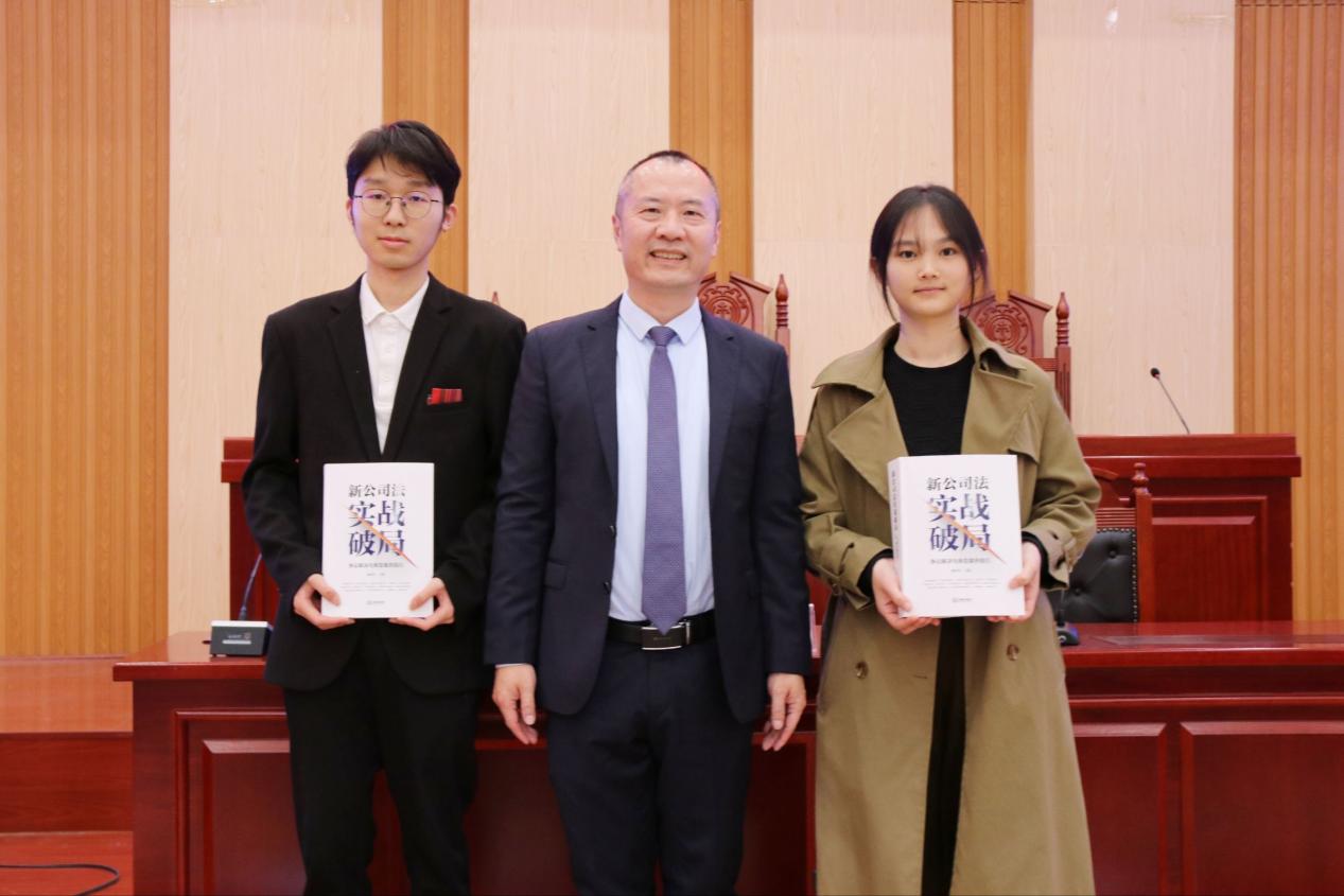 接着,温馨而庄严的赠书仪式正式开启。优秀学生代表张卓轩、刘颖渝步伐稳健地走上台,代表法管学院全体学生接受陈科军学长捐赠的《新公司法实战破局:争议解决与典型案例指引》。接过厚重的书籍时,两位代表深深鞠躬,目光中饱含敬意与感激。他们双手捧着的不只是凝聚着学长实战智慧与行业经验的专业书籍,更是校友对母校学子的深切期望与学术薪火的传承。现场掌声如潮,见证着这份跨越时空的校友情谊,也让“感恩反哺、笃学奋进”的种子在学子心中默默扎根。