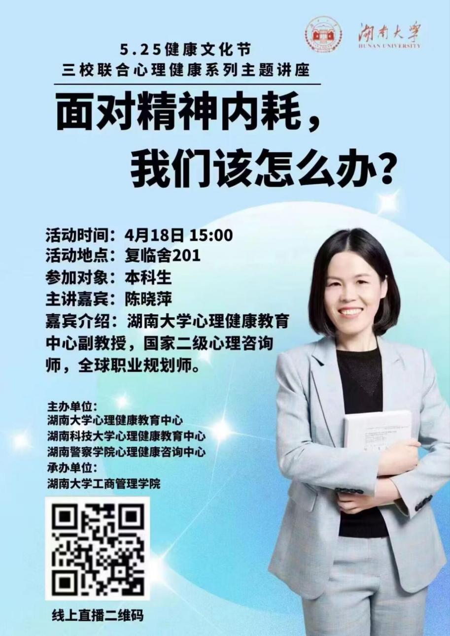 三校于4月18日下午三点联合开展“面对精神内耗,我们该怎么办?”线上主题讲座,湖南大学心理健康中心副教授陈晓萍担任主讲嘉宾。