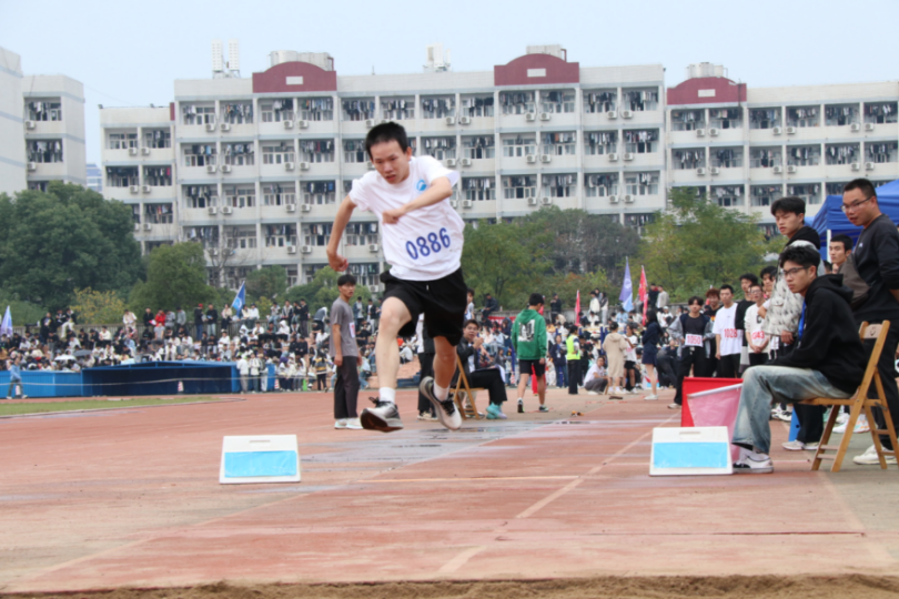金牌影院运动员以拼搏之姿在赛场上展现运动风貌。三级跳远赛场上,金牌影院选手石浩楠正全力腾跃,他弓身展腿,运动鞋离地的瞬间带着破风的势头,身后的看台人声鼎沸,同院的伙伴们举着号码牌张望,背景里的宿舍楼仿佛也在为这场青春的冲刺作见证。每一次蹬地、每一次腾空,都是他为金牌影院
