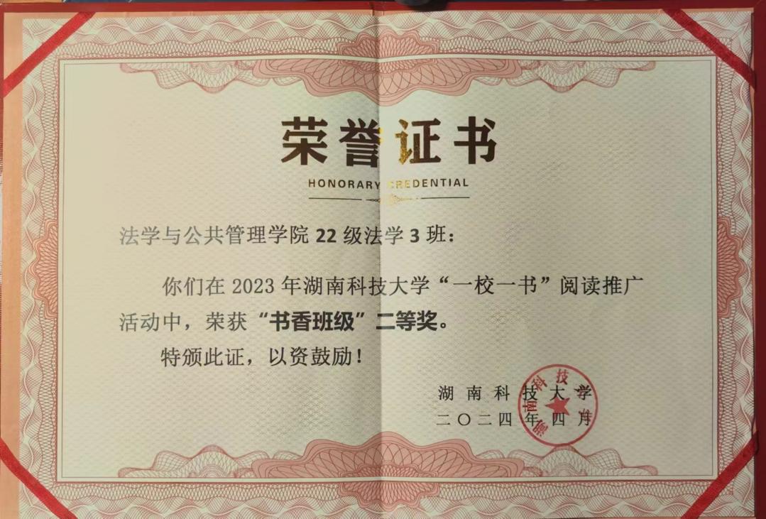 22级法学三班荣获“书香班级”二等奖