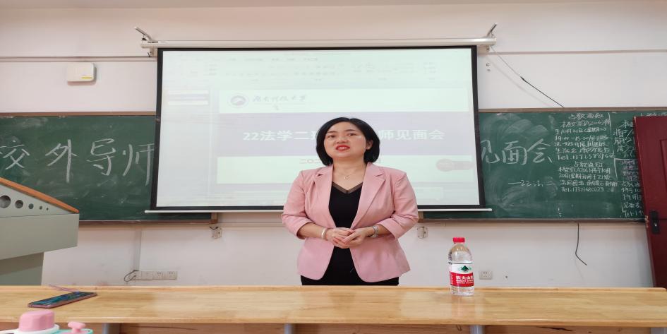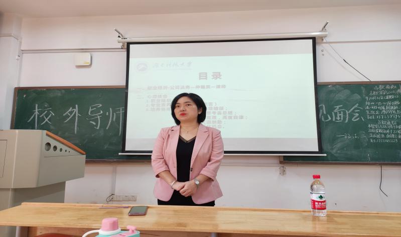 2022级法学二班在立言楼A206教室召开了校外导师见面会。法学专业02级校友现湖南天恒健律师事务所高级合伙人、湖南省律师协会劳动和社会保障专业委员会副主任、湖南省法学会社会法学研究会副秘书长李萍作为校外导师参加了此次见面会。