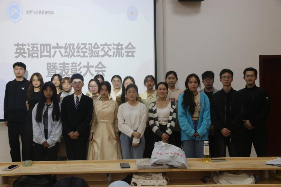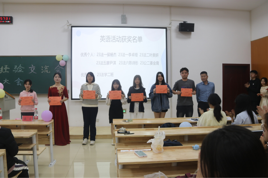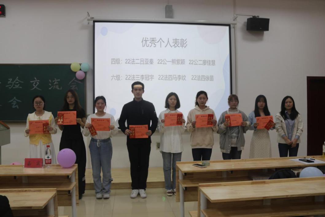 随后,对在2024年度英语四六级考试中取得优秀成绩的个人和班级进行表彰,并由彭钰会老师为他们颁奖,在英语四级考试中成绩优异的同学分别是22法学二班吕亚秦、22公共事业管理一班熊紫颖、22公共事业管理二班廖佳慧;英语六级取得高分的同学分别是22法学三李冠宇、22法学四班马李纹、22法学四班徐苗;英语四六级考试中班级通过率最高的是21法学一班和22法学二班。