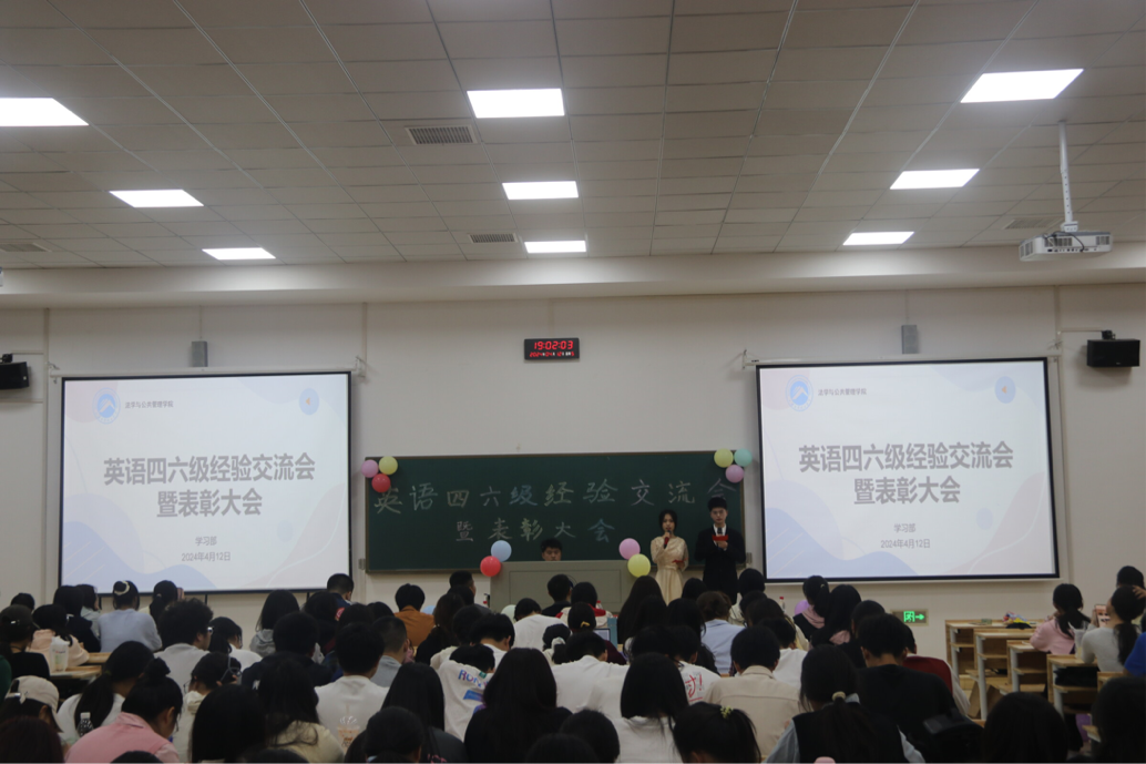 学习部邀请了22法学二班吕亚秦、22法学三班李冠宇、22法学四班徐苗以及22公共事业管理一班熊紫颖作为四六级高分优秀学生代表上台与同学们进行分享。