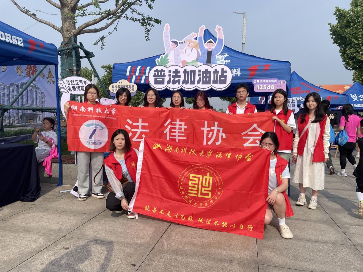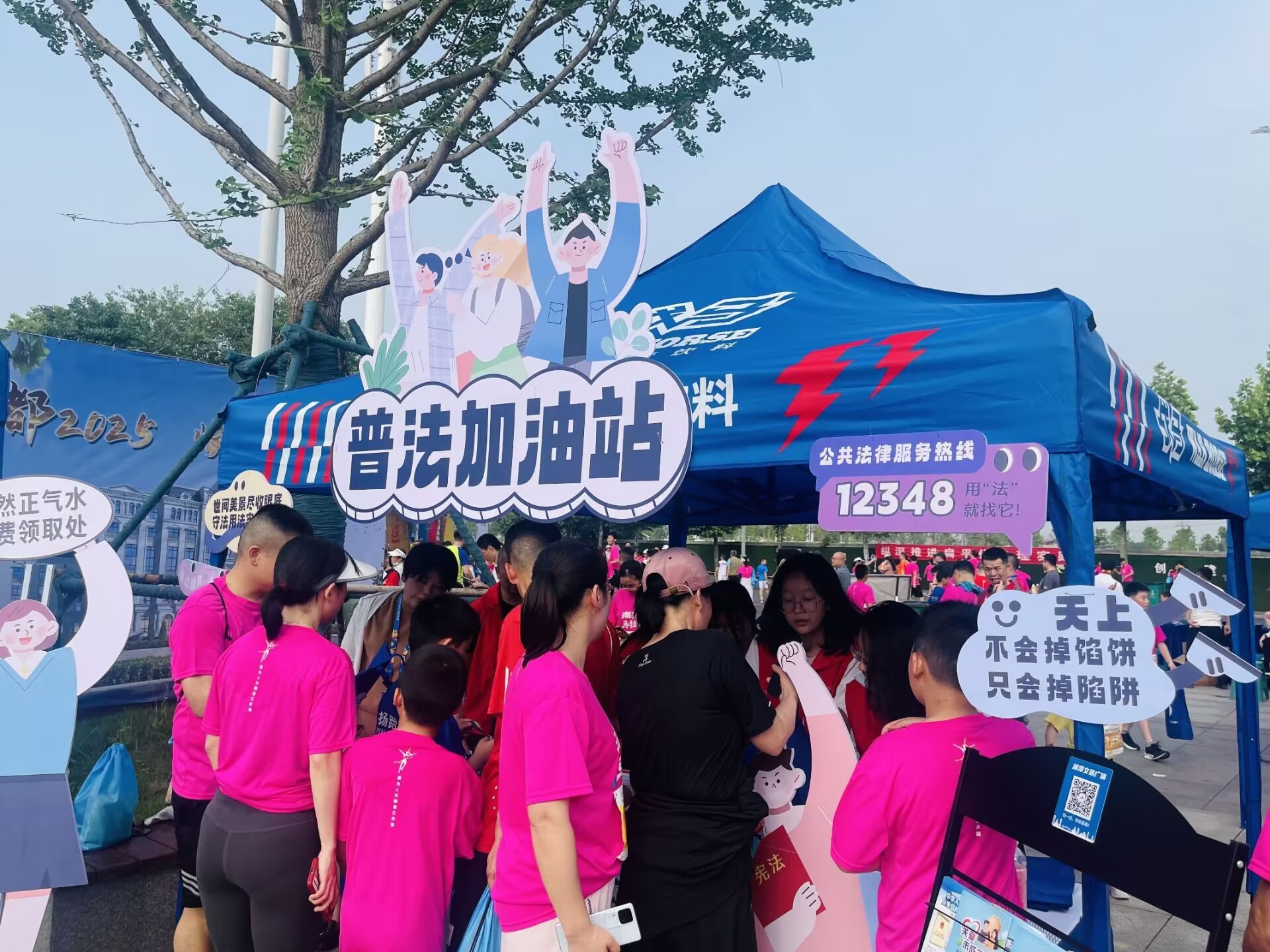 在湘潭市司法局工作人员和陈小杉老师的指导与安排下,法律协会十名志愿者分工协作,有序地展开普法宣传工作。四名志愿者在“普法加油站”站点,通过发宣传册、现场答疑等形式向到达站点的人员普及法律法规知识,并结合实际生活,对前来咨询的人员给予热情解答。同时还会发放普法小礼品,倡导社会公众依法办事,用法律手段维护自身合法权益。其余六位志愿者则在终点站5.20千米立牌处为到达终点的参赛人员拍照打卡进行留念。
