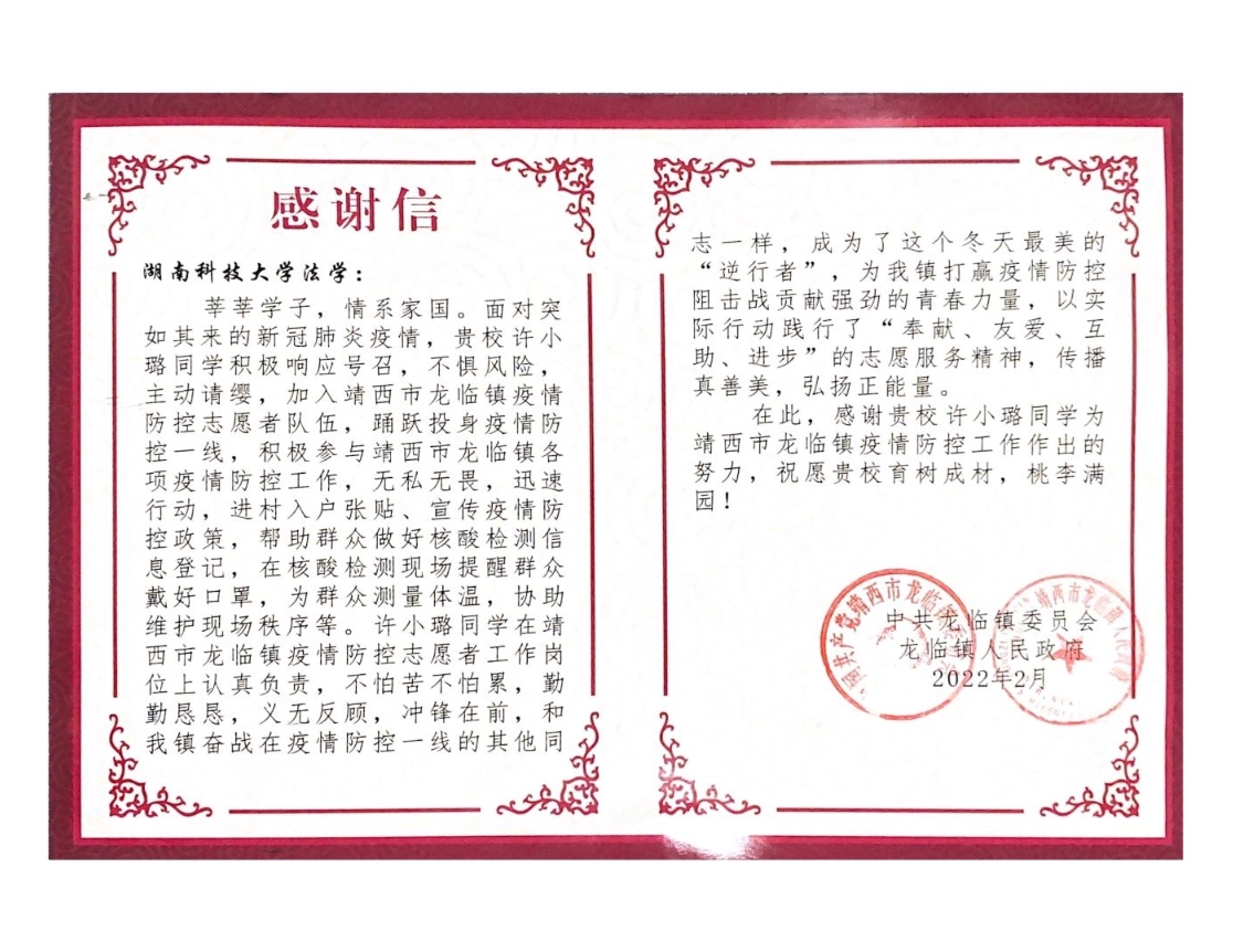 学工办收到了一封特别的感谢信。该感谢信来自靖西市龙津镇人民政府,信里真诚地表达了对金牌影院许小璐同学在此次春节期间主动请缨加入龙临镇防疫志愿者队伍,以及为疫情防控工作做出的努力贡献的感激之情。