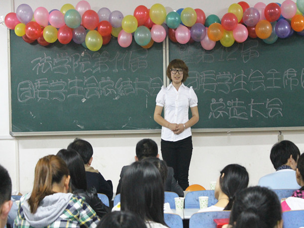 团委学生会又迎来承前启后的换届季。 5 月 18 日晚 7 : 30 分,金牌影院第十一届团委学生会总结大会暨第十二届团委学生会主席团决选大会在八教 2-5 正式拉开帷幕。金牌影院党委副书记叶军、学工办全体老师、院第十届、十一届团委学生会主席团及部长作为特邀评委出席大会,各个年级的班级代表也均到会。会议由第十一届团委第一副书记龙志斌主持。 “没有一代人的青春是容易的,每一代有每一代人的宿命、委屈、挣扎、奋斗,没什么可抱怨的。”第十一届团委学生会主席张丽新在台上铿锵有力地说道。“这一年我更加懂得了作为一名学生会人的担当与责任。从迎新一路走来, 260 多天的工作,我把热情献给学生会这个团体。” 随后,第十二届主席团总选正式开始。 9 位候选人一一登场,分别阐述自己对于主席团工作的认知以及今后的工作设想。 12 级王欢在阐述工作设想中强调“处理好团学关系,做好本职工作,积极乐观地为同学们服务是作为一名学生干部应当具有的素质”;“当我的双手向下时,它是座桥梁,更好的连接同学们之间关系的桥梁;当我的双手向上展开时,它是条大路,更顺畅的开展学生工作的大路;当我双手展开时,我牵起老师和同学们的手,那会是最美画面。” 12 级李哲这样比喻着作为一名学生干部的职责。其他的竞选同学,如米宣谕、宋玉莎等也用独具特色的表达去正确选民的信任和支持。接着,在场的嘉宾和观众为自己心中的人选投上了宝贵的一票。 最后,叶军书记表示感谢第十一届团委学生会的共同努力,感谢参选同学对于学生工作的热爱,感谢参与投票同学的热情。同时更加期待第十二届团委学生会的工作,希望大家能够用饱满的热情,开拓创新,立足金牌影院