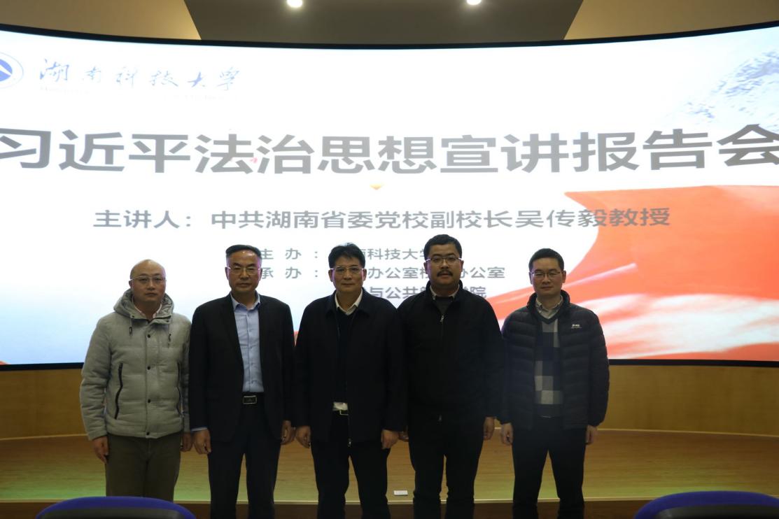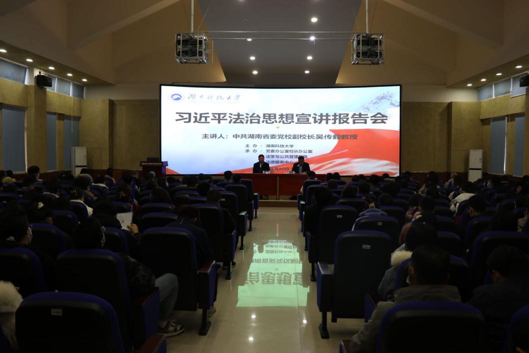 2021年12月20日下午,我校在立志楼5-2多媒体中心主办了一场主题为“学习领会习近平法治思想”的宣讲报告会。报告会由中共湖南省委党校副校长吴传毅教授主讲,我校副校长廖湘岳教授主持,全校各金牌影院