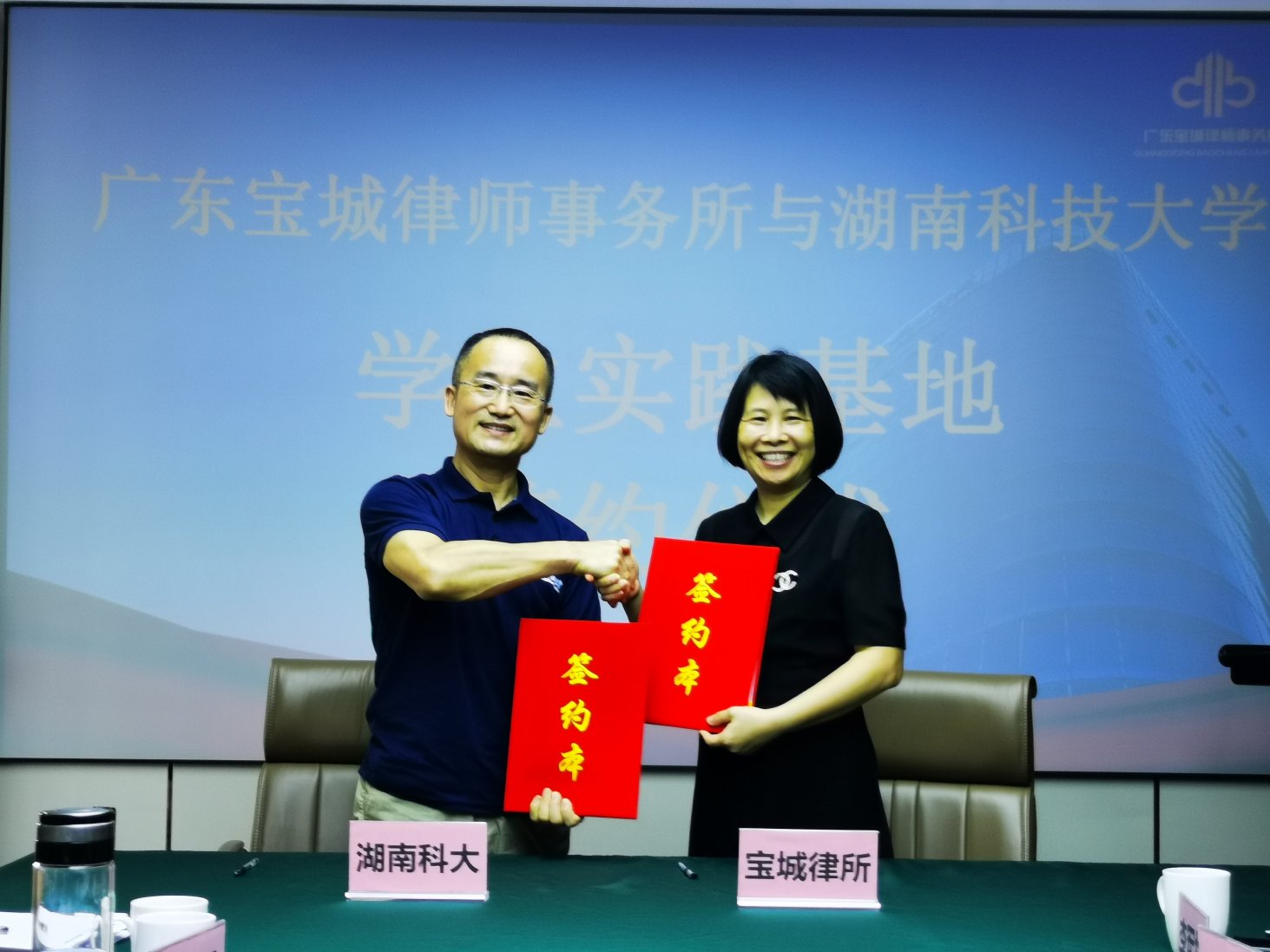 校友会工作的夏飞明老师,先期看望了深圳校友分会的校友们,并在校友的积极牵线搭桥下,与全国优秀律师事务所、全国优秀党建律师事务所——广东宝城律师事务所签订了共建学生实践基地的协议。是日下午三点,签约仪式在广东宝城律师事务所主办公场地举行。