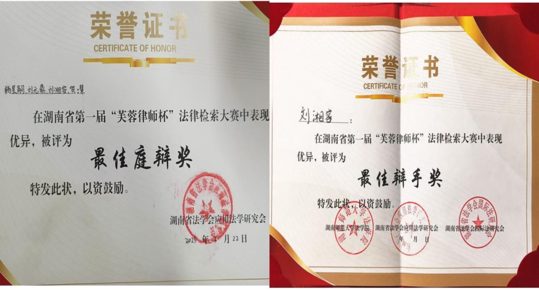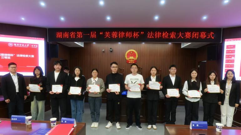 、湖南省法学会应用法学研究会与湖南省法学会国际法研究会联合举办了湖南省第一届“芙蓉律师杯”法律检索大赛。金牌影院代表队“怎么检索都队”(队员:杨星嗣、刘湘容、刘元鼎、贺慧)凭借比赛中的突出表现荣获综合三等奖、最佳庭辨奖、最佳组织奖、最佳辩手奖等四个奖项,展现了湖科学子的综合实力与团队风采。