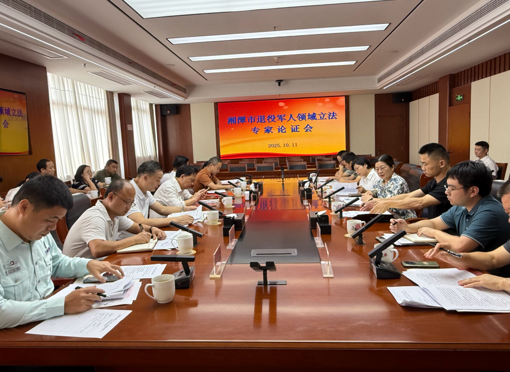 会议由湘潭市退役军人事务局党组成员、副局长周文兵主持,湖南省司法厅、湘潭市人大社会委、湘潭市中级人民法院、湘潭市委网信办、湘潭市财政局、湘潭市律师协会等相关单位专家和省市人大代表出席了本次会议。会议围绕退役军人领域立法的必要性、基本思路、风险评估等问题展开了深入讨论。