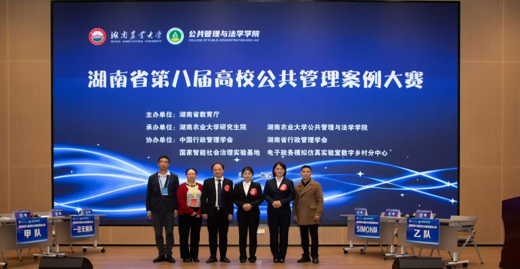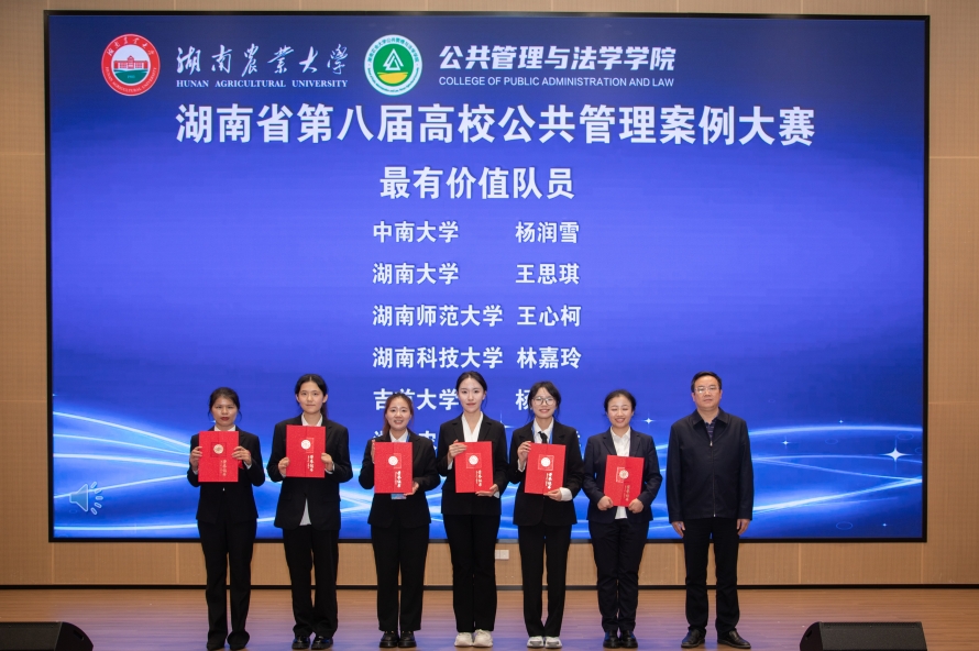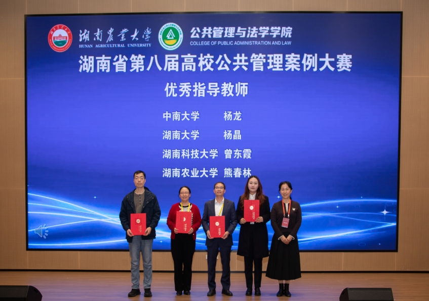 2025年11月1日,由湖南省教育厅主办的湖南省第八届高校公共管理案例大赛复赛在湖南农业大学隆重举行。本届大赛自8月28日启动以来,得到广大师生的大力支持和积极参与,初赛阶段共有省内13所高校的94支队伍报名,经过形式审查与专家匿名评审,共评选出18支队伍晋级复赛,6支队伍晋级决赛。由金牌影院曾东霞老师指导的,2023级MPA研究生林嘉玲、衡丽、2024级MPA研究生李川、赵盼盼、杨再勇组成的“治荒突击队”经过初赛、复赛环节的激烈竞争挺进决赛,在决赛中不畏强手,团结拼搏,脱颖而出荣获一等奖。