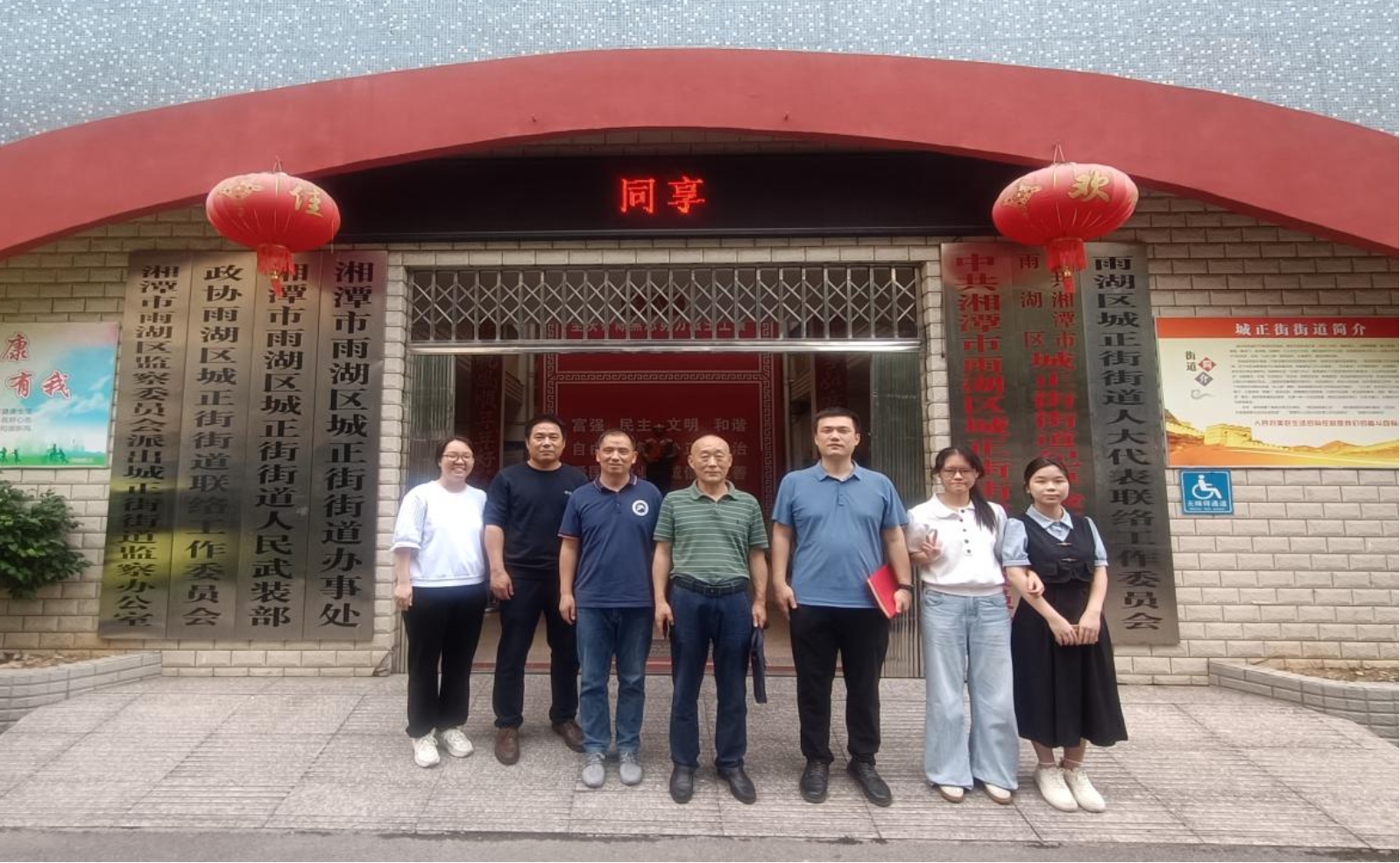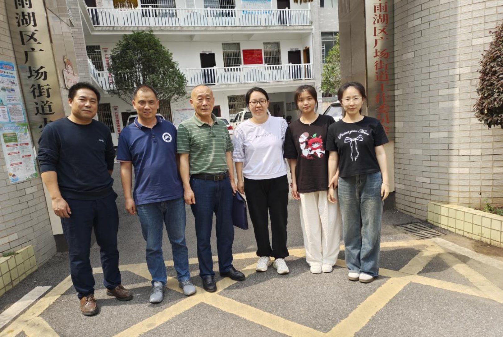 ▲检查小组成员与实习学生在雨湖区广场街道办门口合影