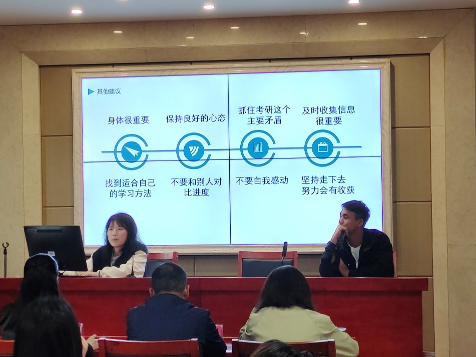 副院长宋智敏,法律服务中心主任马驰升,法学系主任吴四江,公管系主任戴年红,法学系夏飞明、周玉利,公管系徐金燕、王慧慧、尚天晓、李凤翔,辅导员朱荣、李斌等多位老师莅临会议。法学欧阳佩佩、李云浩、孙昕文、刘芷若,公管唐艳君、王秀、毛小龙、杨陆等八位18级考研上岸的优秀学子受邀前来进行考研经验交流与分享。法管金牌影院