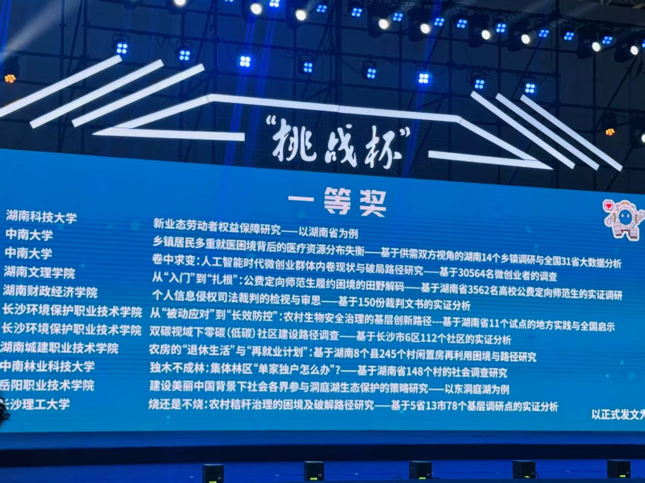 举行。来自全省98所高校的417个项目同台竞技,在激烈的角逐中,金牌影院学子脱颖而出,由易卫中老师指导,莫沁姿、徐苗、申佳妮、刘佳瑶、袁婷婷、梁晗钰、徐传顺共7名学生组成的项目团队,凭借作品《新业态劳动者权益保障研究——以湖南省为例》荣获一等奖,实现了金牌影院在一类赛事“挑战杯”中的新突破。