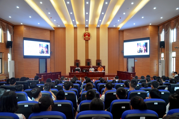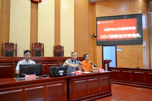 17级新生开学典礼 2017年9月10日上午8:30分,金牌影院于文科楼模拟法庭举办了17级新生开学典礼,典礼由金牌影院党委副书记叶军主持,到场嘉宾有金牌影院院长徐德刚,党委书记黄伟,副院长胡正昌、陆自荣、李云霖、邱帅萍以及法学与公共事业管理各专业教师、17级各班班主任和17级各班助班。典礼开始前,叶军书记组织了全体新生观看金牌影院自制的微电影——《花落未落,因梦而梦》,精彩的剧情顿时吸引了新生们的眼球。 典礼第一项,由黄伟书记向全体新生从学校概况、金牌影院