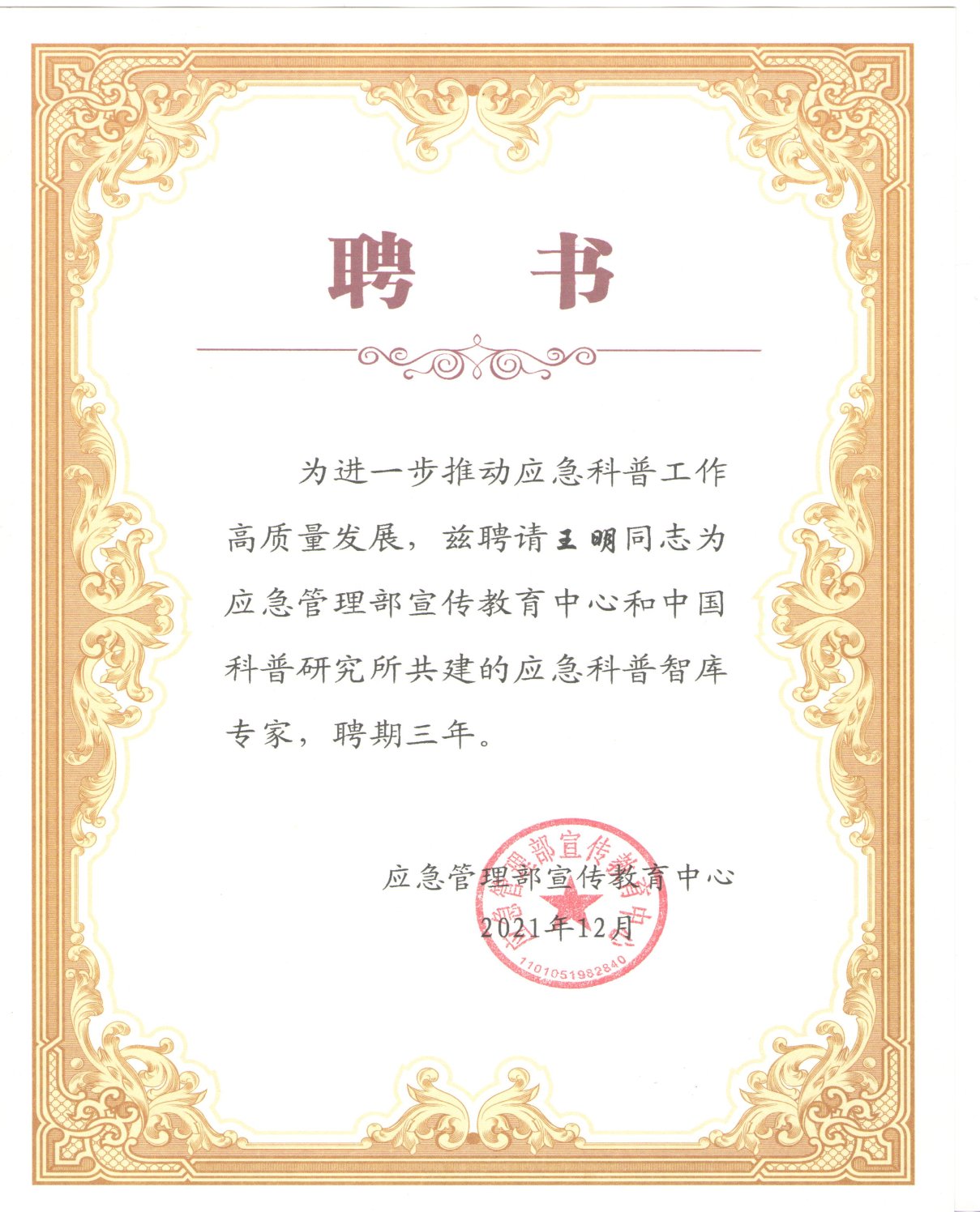 金牌影院王明副院长获聘应急管理部宣传教育中心应急科普智库专家