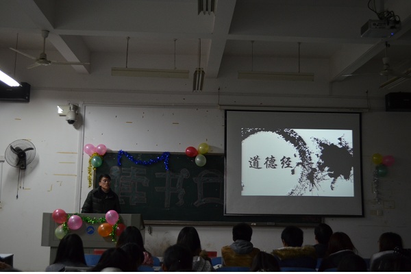 思想政治教育系主任毛小平、毛研会指导老师杨盛军以及辅导员老师伍安、赵晗冰。 “经典著作是中华民族精神的源头,人类文化的瑰宝,开启大学生的心智,与其追捧时尚不如诵读经典。”来自13级思政一班的林豪庭用自己独特的见解来重温《道德经》。他从老子的出生传说讲到老子与道家文化,为大家讲述了关于“道”的内容。他说:“‘道’是中国乃至东方古代哲学的重要哲学范畴,是世间万物之母。遵循自然规律、清静无为、返璞归真才是至高无上的境界。”此外,林豪庭同学还选取《道德经》中的一章节《上善若水》供大家品味,针对“夫唯不争,故无忧”,他提出:“现在的人过于贪婪,为了获得利益不择手段,而道家的‘不争’正是我们所缺失的东西。” 而来自13级思政二班的姚逸飞同学则为大家讲述“重走红军长征路”,除了讲述红军长征的原因与过程、遵义会议等耳熟能详的故事,还有鲜为人知的会宁会师、腊子口战役。最后,他表示:“首先,作为当代大学生不能忘记历史,忘却就意味着背叛;其次,大学生做人做事一定要踏实,要实事求是。” 会后,毛小平老师总结道:“大学生要学会对人生、对社会进行思考,多读书,读好书,从而提升自己的修养。”同时,毛老师也提议读书交流加强互动环节,可以围绕一本书或一个话题进行深入的探讨,祝愿毛研会的读书交流会能够越办越好。 (责任编辑:admin) |