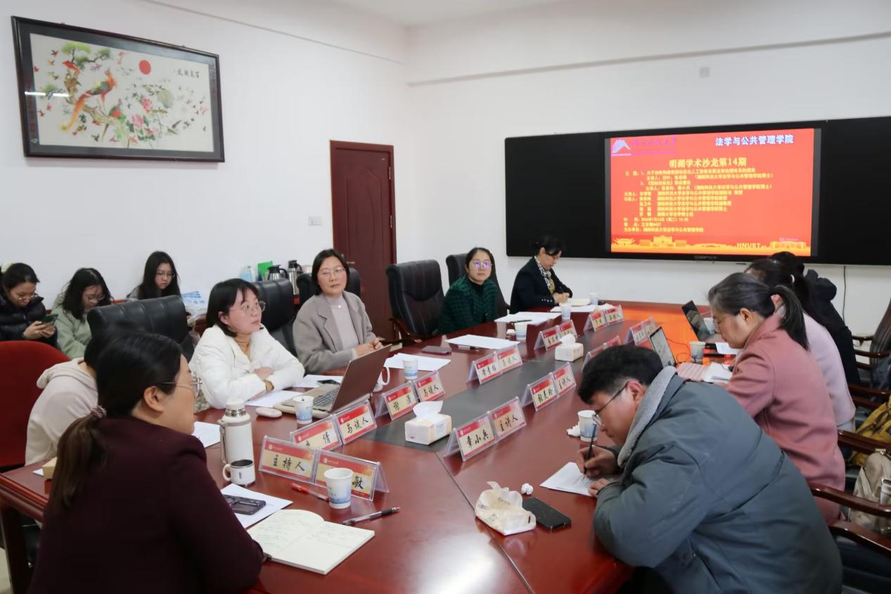 第14期“明湖学术沙龙”在立言楼A427如期举行。本期沙龙聚焦“关于加快构建我国信息化人工智能发展法律治理体系的提案”与“《招标投标法》修改建议”两大主题,特邀汪叶、张春雨、张美玲、章小兵四位老师担任主讲人,并邀请黄素梅教授、易卫中副教授、李倩副教授、谢潇博士作为与谈人参与研讨,湘潭大学法学博士后罗珊老师应邀出席,部分研究生参加了此次沙龙活动,沙龙由副院长宋智敏教授主持。