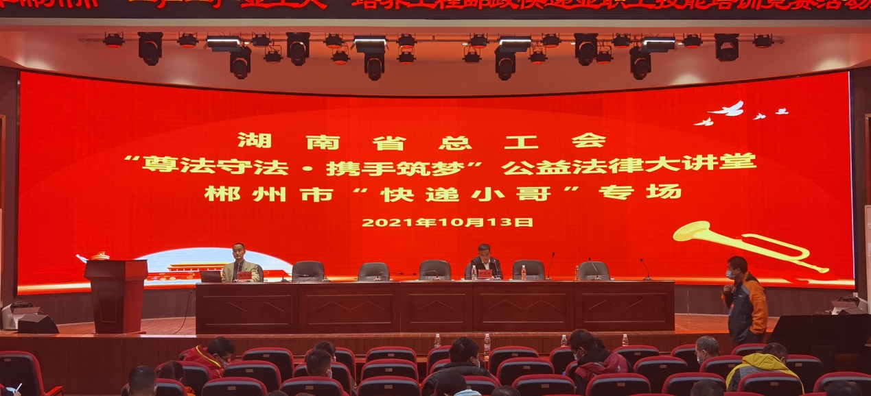 为做好八五普法工作,更好服务工会会员和各类劳动者,今年,湖南省总工会专门成立了由20位法律专业人士组成的“法治宣讲团”,金牌影院徐德刚教授荣幸成为宣讲团成员。国庆节后,湖南省总工会“尊法守法、携手筑梦”公益法律大讲堂正式拉开帷幕。10月13日,受省总工会统一安排,金牌影院徐德刚教授应邀到郴州市总工会开展法制宣讲,为120位“快递小哥”送去了一份法律大餐。