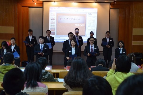 共同创办的社区法治服务协会创立大会在五教 2-4 教室正式拉开帷幕,青少年法制宣讲课这一项目也正式启动。出席此次大会的嘉宾有湘潭市律师协会副会长晏军、湘潭市雨湖区人民检察院四级高级检察官姚恩明、法律援助中心副主任宋军以及金牌影院与潇湘金牌影院