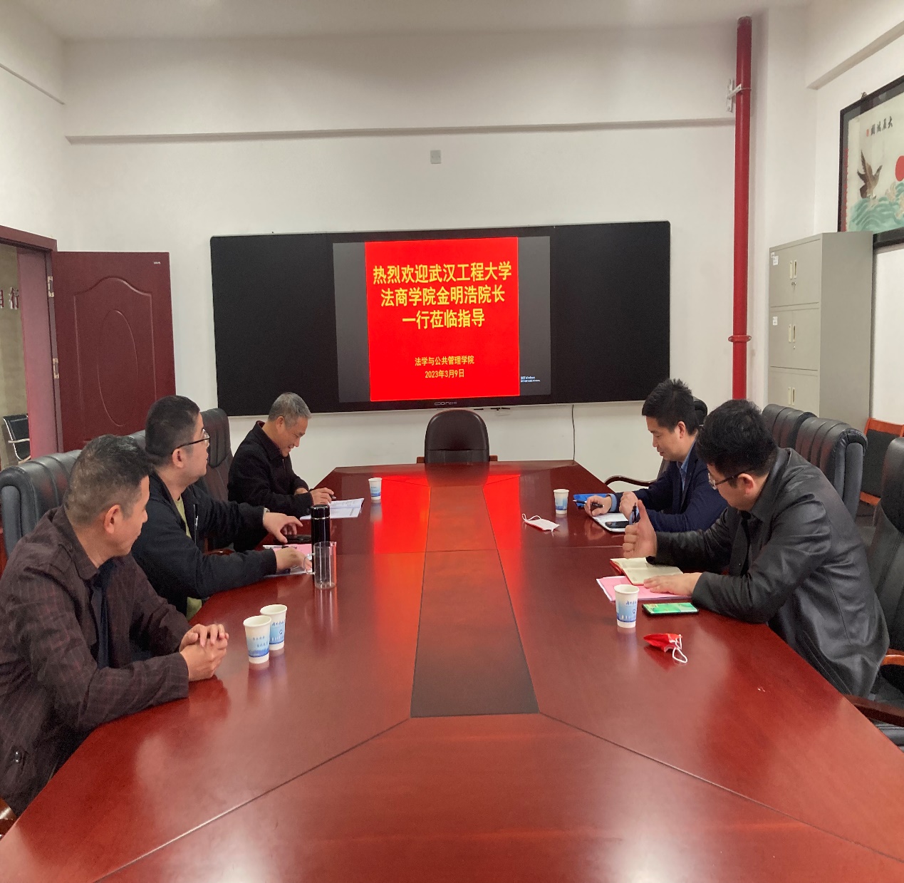 随后金明浩院长一行,又分头参观了金牌影院院史陈列墙,资料展示墙,并就新时代法学专业的发展进行了深入交流。