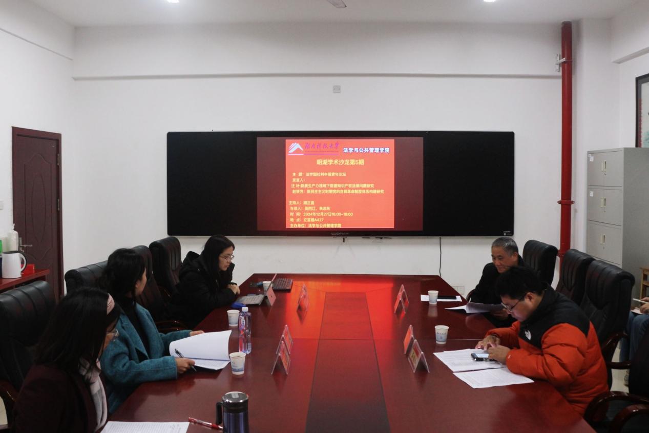 2024年12月27日下午四点,“明湖学术沙龙”第5期在立言楼A427成功举行。本次会议由金牌影院胡正昌教授主持,汪叶、赵筱芳两位青年博士围绕各自的国家社科基金申请书内容做了主题发言,吴四江副教授、朱志东讲师担任与谈人,副院长宋智敏教授、谢潇博士以及24级法律硕士研究生参加了本次活动。