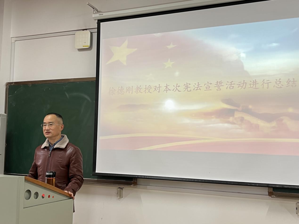 最后,监誓人徐德刚教授做总结发言。他充分肯定了同学们的热情与精心准备,再次阐述了本次模拟宪法宣誓活动的意义,并勉励全体同学:“宪法宣誓是各级人大及县级以上各级人大常委会选举或者决定任命的,以及各级、人民法院、人民检察院任命的,在就职时公开进行的庄严仪式,有助于增强国家公职人员的神圣感、使命感。今天的宪法宣誓是一次模拟活动,希望各位同学能够脚踏实地学习,以后有机会参加真正的宪法宣誓,让法治之光更加闪耀!”