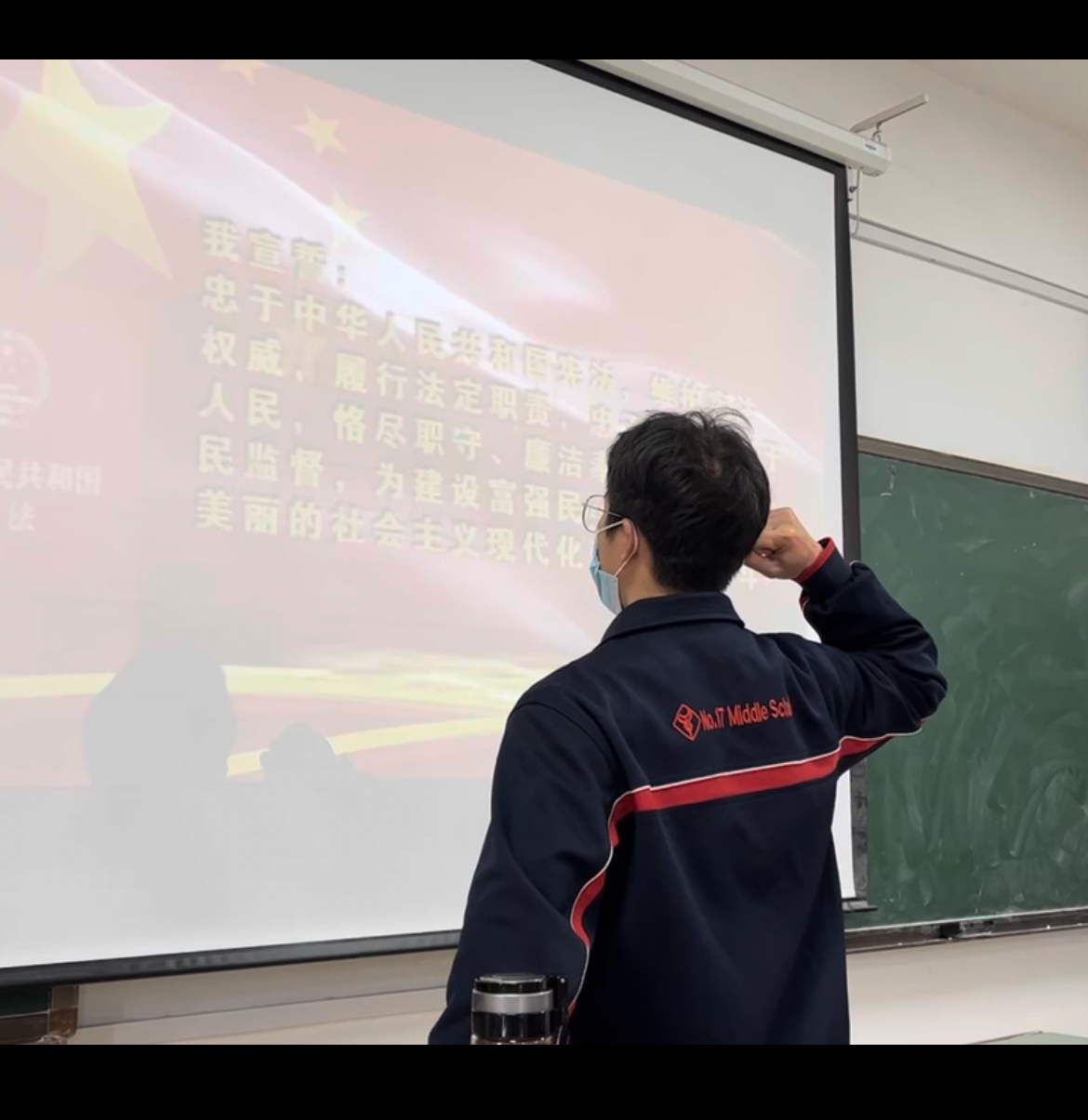 “知是行之始,行是知之成”,为了增强同学们的宪法意识,筑牢宪法信仰,自觉遵守、坚定捍卫宪法权威,大力弘扬宪法精神,实现宪法理论与实践的有机结合,3月24日上午,21级法学三、四班全体同学在立功楼B508举办了一次模拟宪法宣誓活动。活动由法学四班雷洋同学主持,《宪法学》主讲教师徐德刚教授监誓。