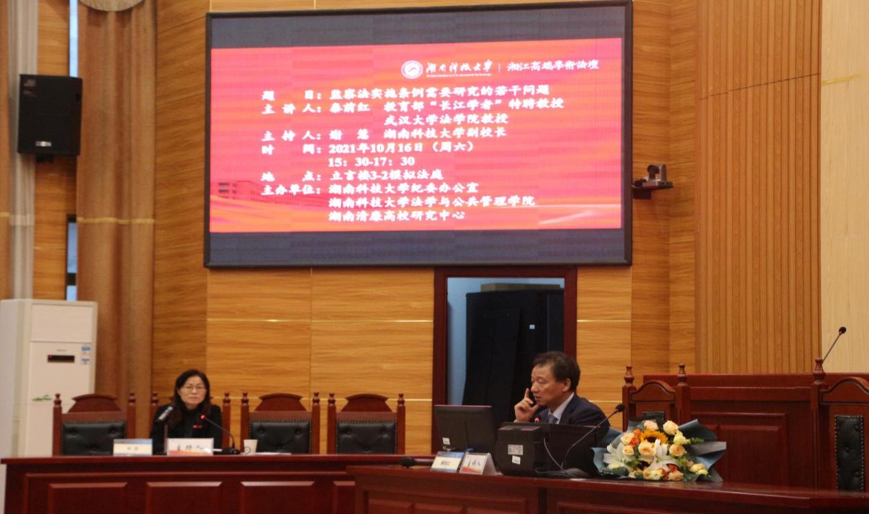 2021年10月16日下午,教育部“长江学者”,武汉大学博士生导师,《法学评论》主编秦前红教授应邀来我校开展了“监察法实施条例需要研究的若干问题”的专题讲座。本次讲座由我校谢慧副校长主持,校全体纪检监察委员、湖南清廉高校研究中心成员、法管金牌影院