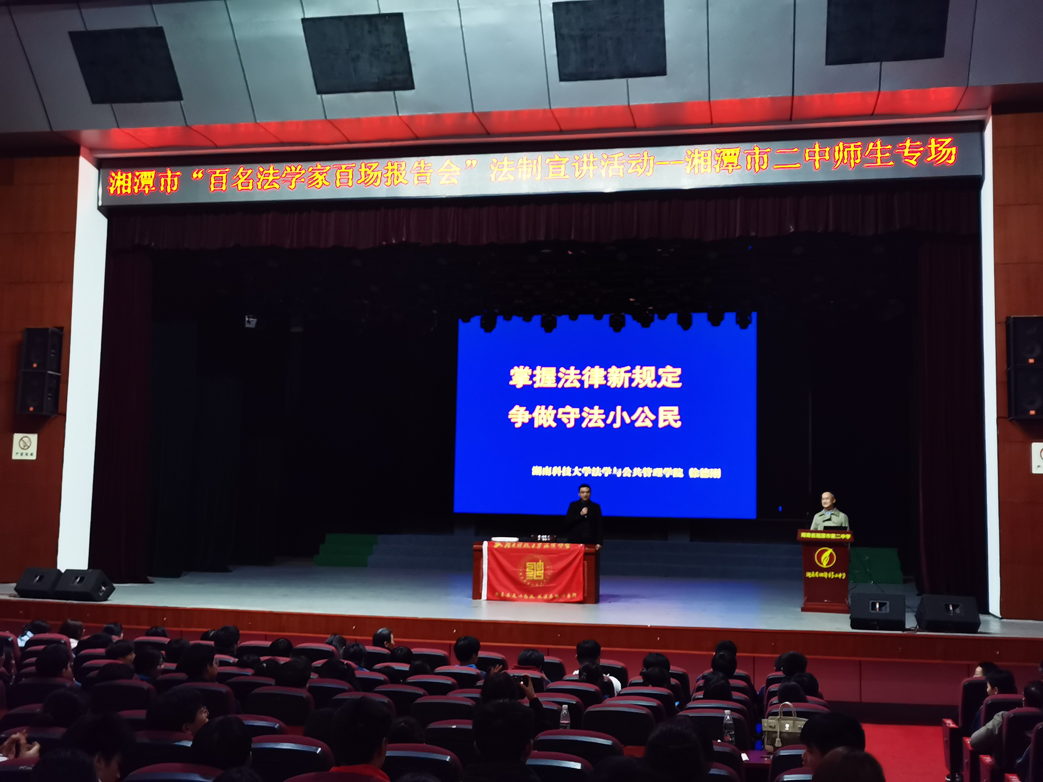 为深入学习、宣传和贯彻习近平法治思想,增强中学师生法治意识,2023年03月23日,湘潭市“百名法学家百场报告会”法治宣讲活动——-湘潭市二中师生专场于下午4:30在湘潭市二中艺术楼三楼演艺大厅举行。金牌影院徐德刚教授带领金牌影院