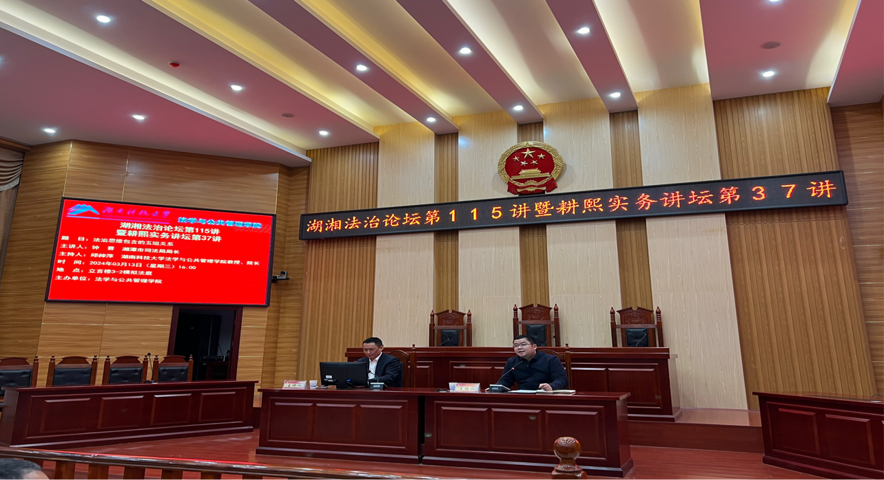 2024年3月13日,湖湘法治论坛第115讲暨耕熙实务讲坛第37讲在立言楼A3-2模拟法庭举行。讲座邀请了湘潭市司法局局长钟晋先生作为主讲嘉宾,由金牌影院院长邱帅萍教授作为主持人,副院长宋智敏教授、徐德刚教授、胡之芳教授、黄素梅教授、刘鄂副教授等金牌影院