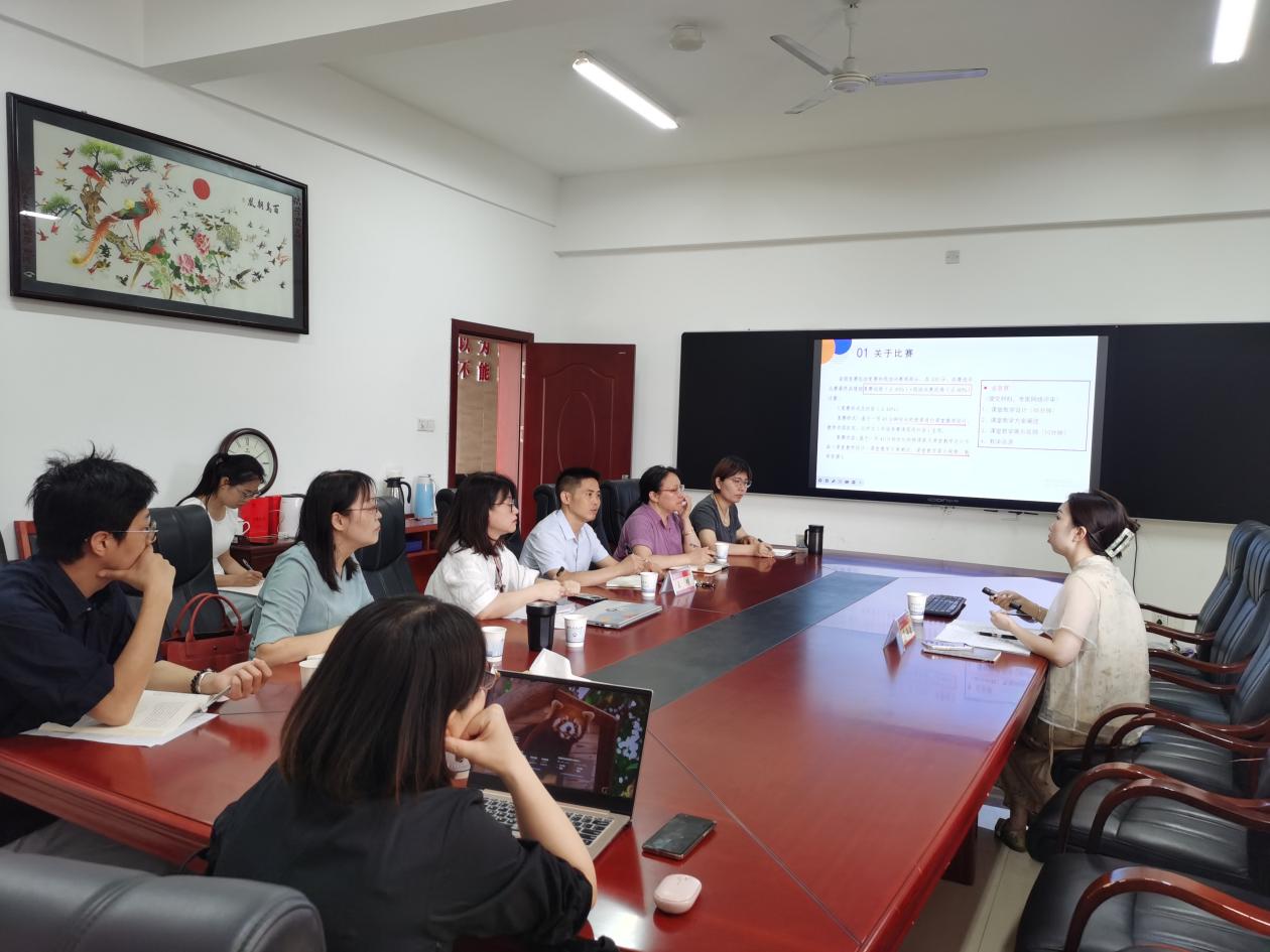 廖雨洁老师分享赛事经验,会议由教学副院长王明教授主持,金牌影院有意参加相关教学赛事的教师到会学习。