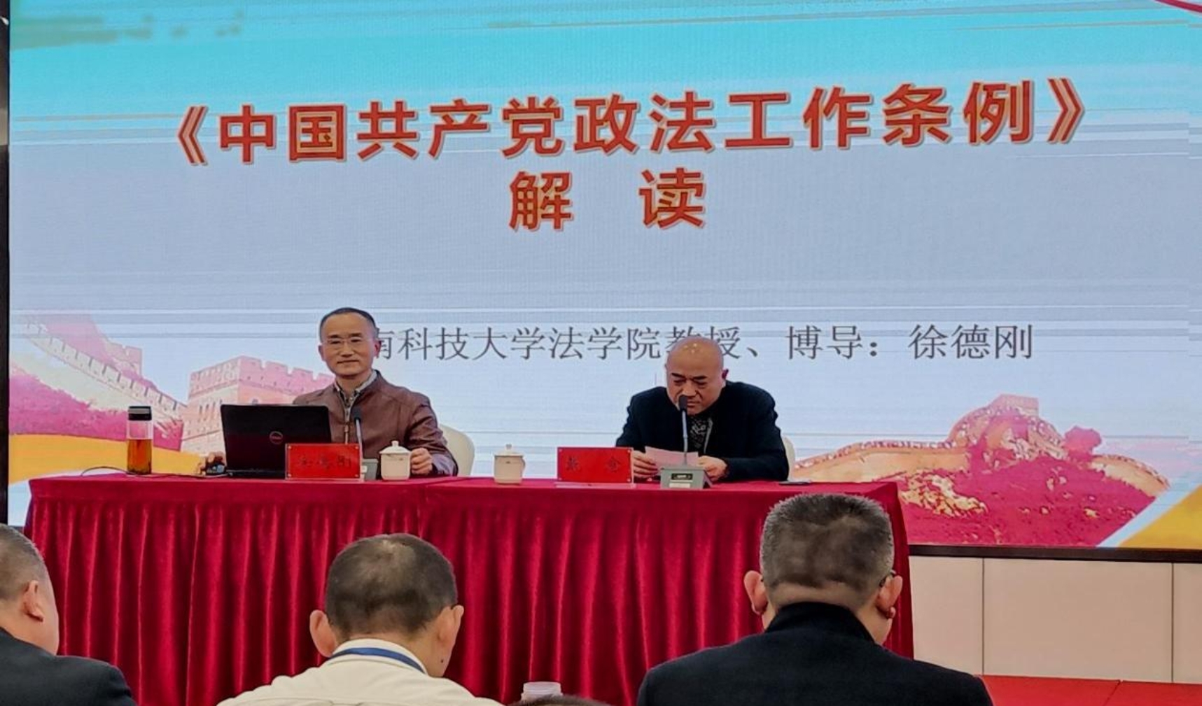 为进一步提升湘潭市乡镇(街道)政法委员的履职能力,强化对基层政法工作的领导,湘潭市委政法委近期举办了为期三天的乡镇(街道)政法委员能力提升培训班。11月10日,金牌影院徐德刚教授应邀为湘潭市下属县市区政法委领导和各乡镇(街道)党委副书记、政法委员共60余名学员授课,主讲了《<中国共产党政法工作条例>解读》一课,湘潭市委政法委专职委员戴愈主持讲座。