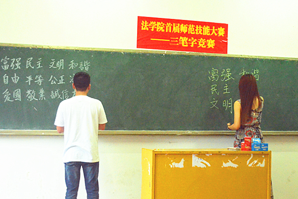 第一届师范生技能大赛---三笔字决赛,于十教203、206教室举行。金牌影院院长廖家林,副院长胡正昌、陆自荣,思想政治系系主任毛小平,哲学系系主任颜中军,思政系朱学恩、杨盛军老师莅临活动现场。 本次大赛的参赛选手由13-15级思政专业各班推荐,比赛项目分别是钢笔、粉笔和毛笔,以软硬笔为标准分别在两个教室同时进行。书写内容分为必写和任意两部分,形式灵活多样,内容生动。在他们上交的参赛作品中,既有恣情挥毫的毛笔字,也有行云流水般的行书,还有娟秀工整的楷书。比赛结束后,评委对他们的作品做出了公正的裁判,并对本次大赛给予了高度的评价。高松、甘恒业凭借其坚实的书法基础斩获了本次比赛的一等奖,另有14人荣获二等奖和三等奖。 此次师范生书法比赛的举办,让我们领略了思想政治教育系同学们的独特才情,给书法爱好者提供了一个展现才艺的平台,更对师范生书法技能的提高起到了很好的推动作用。在幽幽的墨香中,三笔字的决赛落下帷幕。 (责任编辑:admin) |