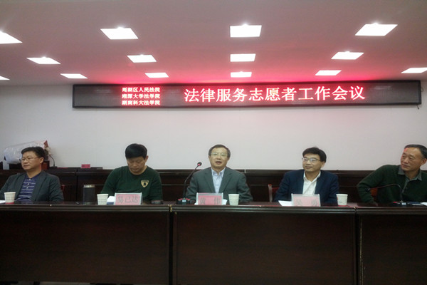 9月30日下午4点30分,由雨湖区人民法院主办的法律服务志愿者工作会议在雨湖区人民法院会议室举行。此次会议主要是对2015-2016年度的首届大学生志愿者导诉工作进行总结,表彰表现优秀的志愿者,并启动第二届导诉工作。该会议由雨湖区法院副院长王德云主持,金牌影院党委书记黄伟、副院长胡正昌以及法学一系副主任刘鄂应邀参加会议。 “去年11月,金牌影院与金牌影院