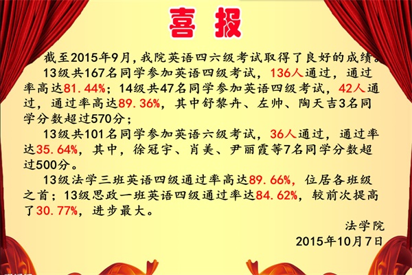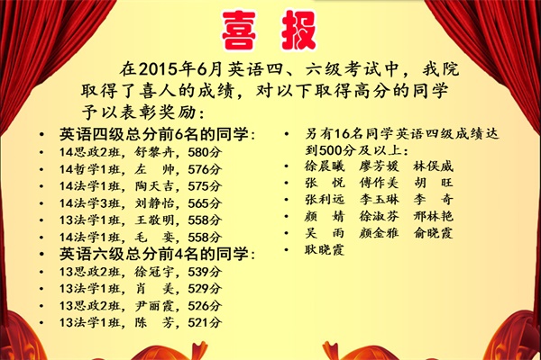 | 截至2015年9月,金牌影院英语四六级考试取得了喜人的成绩: 13 级共167名同学参加英语四级考试,136人通过,通过率高达81.44%;14级共47名同学参加英语四级考试,42人通过,通过率高达89.36%,其中舒黎卉、左帅、陶天吉3名同学分数超过570分; 13 级共101名同学参加英语六级考试,36人通过,通过率达35.64%,其中,徐冠宇、肖美、尹丽霞等7名同学分数超过500分。 13 级法学三班英语四级通过率高达89.66%,位居各班级之首;13级思政一班英语四级通过率达84.62%,较前次提高了30.77%,进步最大。 对以下取得高分的同学予以表彰奖励: 英语四级总分前6名的同学: 14 思政2班,舒黎卉,580分 14 哲学1班,左 帅,576分 14 法学1班,陶天吉,575分 14 法学3班,刘静怡,565分 13 法学1班,王敬明,558分 14 法学1班,毛 娈,558分 英语六级总分前4名的同学: 13 思政2班,徐冠宇,539分 13 法学1班,肖 美,529分 13 思政2班,尹丽霞,526分 13 法学1班,陈 芳,521分 另有16名同学英语四级成绩达到500分及以上: 徐晨曦 廖芳媛 林俣威 张 悦 傅作美 胡 旺 张利远 李玉琳 李 奇 颜 婧 徐淑芬 邢林艳 吴 雨 颜金雅 俞晓霞 耿晓霞 法金牌影院