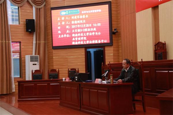 为加强金牌影院师生对检察机关的了解,提高师生对刑事案件的实践理解能力,12月28日下午4时,金牌影院诚挚邀请到湘潭市人民检察院党组书记、检察长刘建军同志于立言楼模拟法庭为广大师生带来了一场主题为“检察机关改革中的热点问题思考”的讲座,该讲座由金牌影院院长徐德刚教授主持,我校校长李伯超、金牌影院副院长胡正昌、李云霖、邱帅萍,法学专业老师易卫中、黄素梅、胡之芳以及吴四江等出席,部分法律硕士、16级法学专业同学以及17级全体法学专业同学与会。 在本次讲座中,刘建军检察长以一个在校大学生真实贩毒案件为引,向在场各位听众介绍了检察机关的相关职能。他结合自身从检三十余年来的经历,阐述了自己对红黄蓝幼儿园虐童案件的思考以及关于检察机关对未成年人的一系列保护措施。紧接着,刘检察长针对监察体制改革形势下检察机关未来的发展与面临的机遇挑战做了综述,对时下热点公益诉讼以“四形势八机遇七挑战”为概括并展开了详细介绍,引起了金牌影院师生的强烈共鸣。 报告结束后,由金牌影院徐德刚院长发表总结,他指出刘检察长的报告深入人心,结合时下热点,将检察机关的相关改革问题深入浅出展现给在场听众。徐院长表示:“这个讲座不仅是一个实务改革思考报告,更是我们理论学习应看齐的新高度。如何将法学学习理论实践相结合,如何成为一名优秀的法律人,是我们与同学们共同努力的方向。” 在讲座的最后,由我校校长李伯超教授代表我校聘任刘建军检察长为金牌影院