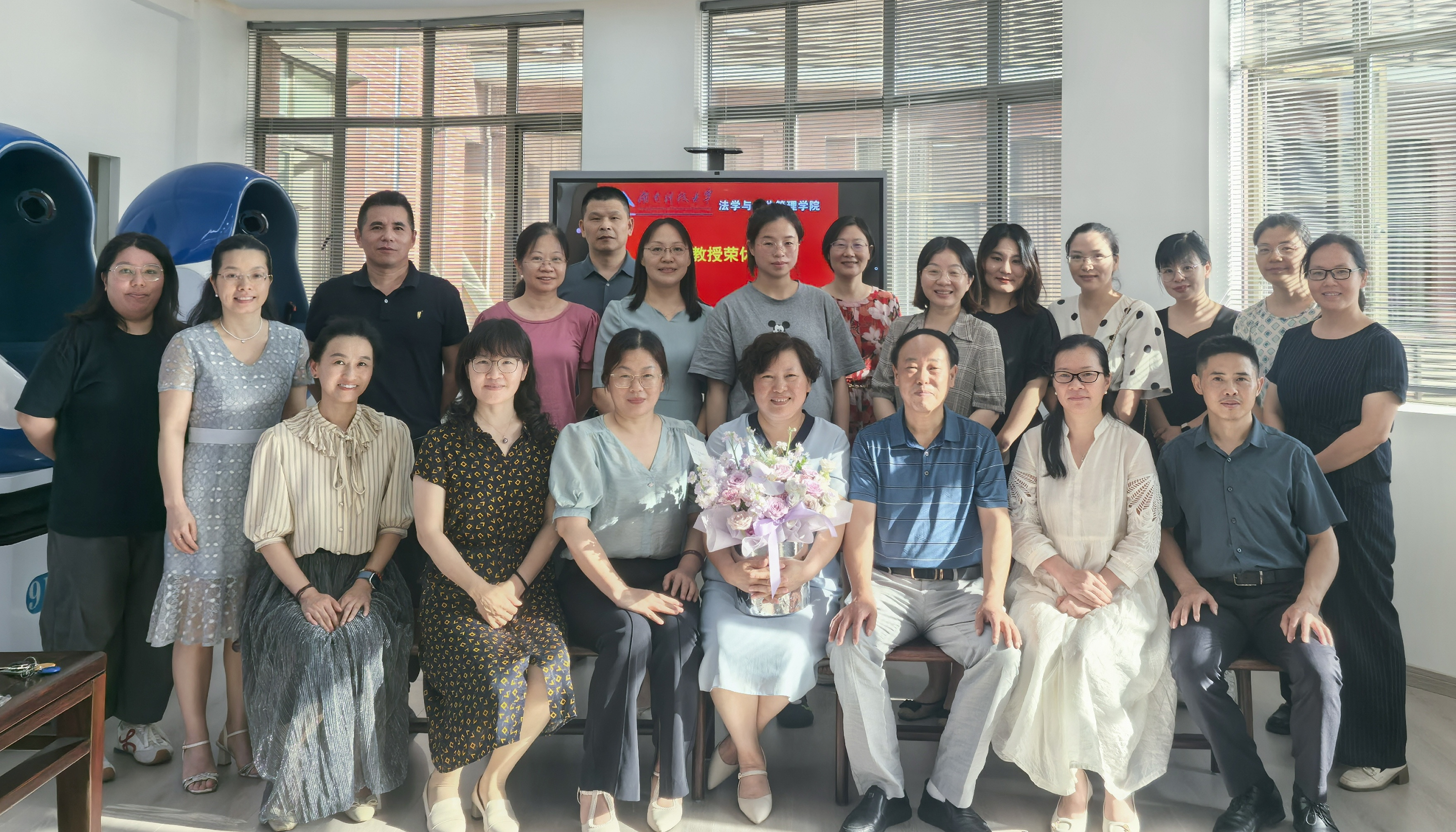 领导班子成员共同走向台前,向蒋兰香教授献上鲜花与纪念品。在快门定格的瞬间,全体与会人员共同与蒋兰香教授合影留念,将这份深厚情谊与难忘时刻永久珍藏。这场荣休仪式不仅是对蒋兰香教授教育科研生涯的致敬,更是法治精神与育人情怀的薪火相传,激励着新一代法学人在追求公平正义的道路上笃定前行。